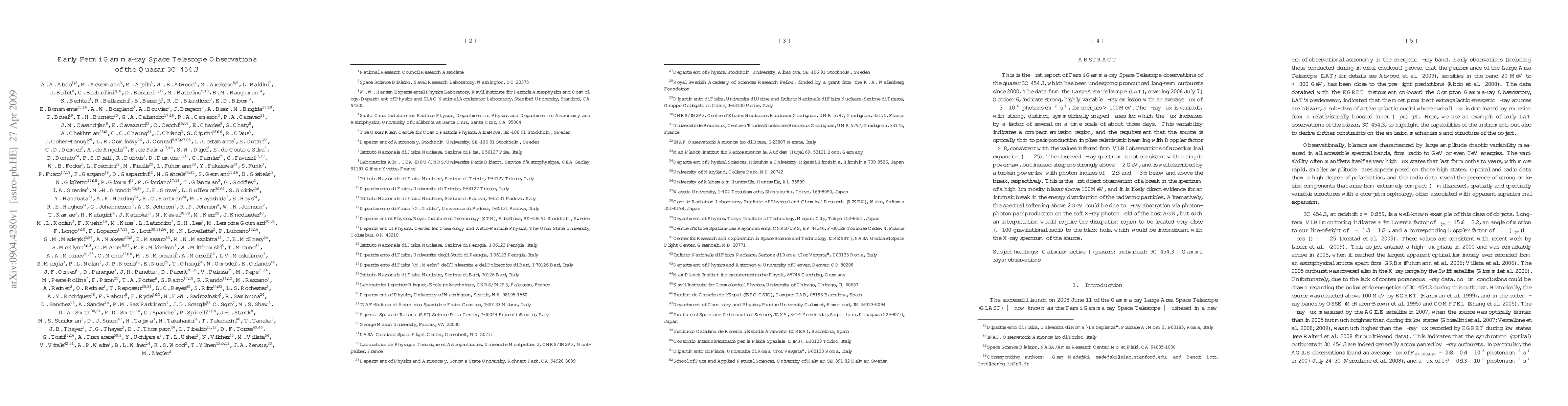 The Fermi Gamma-ray Space Telescope observed significant, highly variable gamma-ray emission from the quasar 3C 454.3, indicating a compact emission region and relativistic beaming. The spectrum shows a break above 2 GeV, suggesting an intrinsic particle energy distribution break or absorption effects near the black hole.