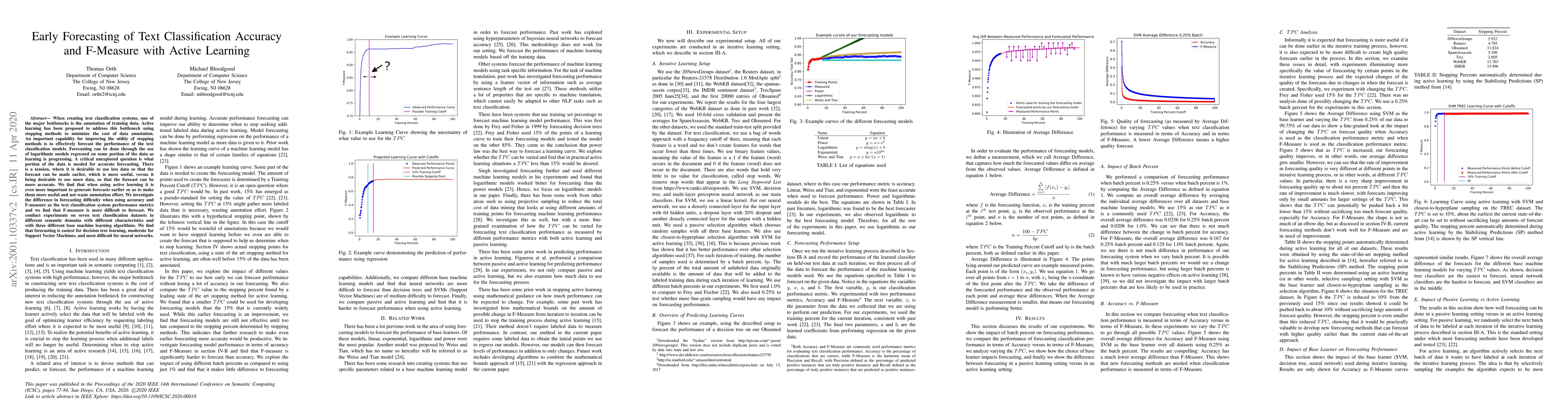 This paper explores early forecasting of text classification accuracy and F-measure using active learning to minimize annotation costs. It finds that while forecasting performance earlier is more useful, F-measure is harder to forecast compared to accuracy, and that decision trees are easiest to forecast, followed by Support Vector Machines and neural networks.