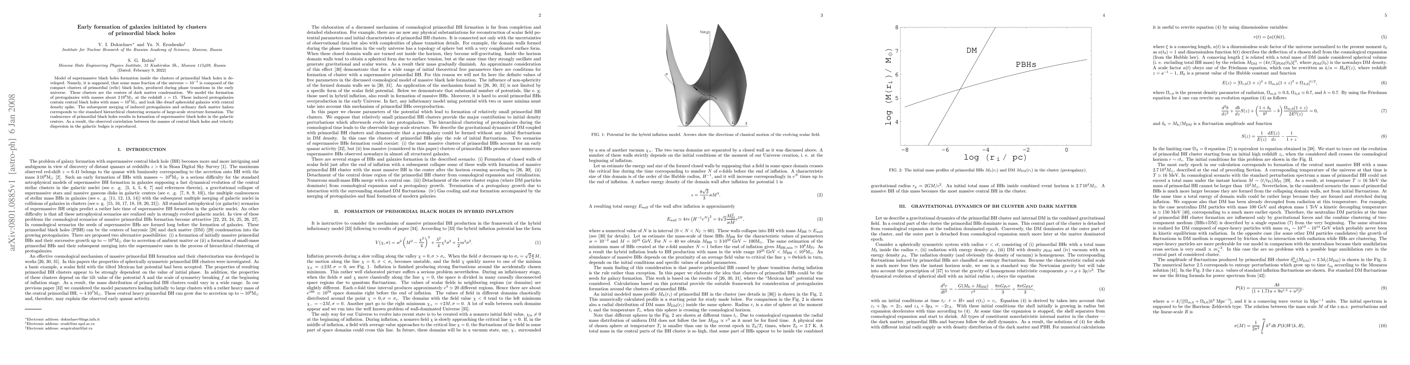This paper proposes a model where clusters of primordial black holes formed in the early universe initiate the formation of protogalaxies, leading to the development of supermassive black holes in galactic centers. The model explains the observed correlation between central black hole masses and galactic bulge velocity dispersions through the merging of primordial black holes and protogalaxies.