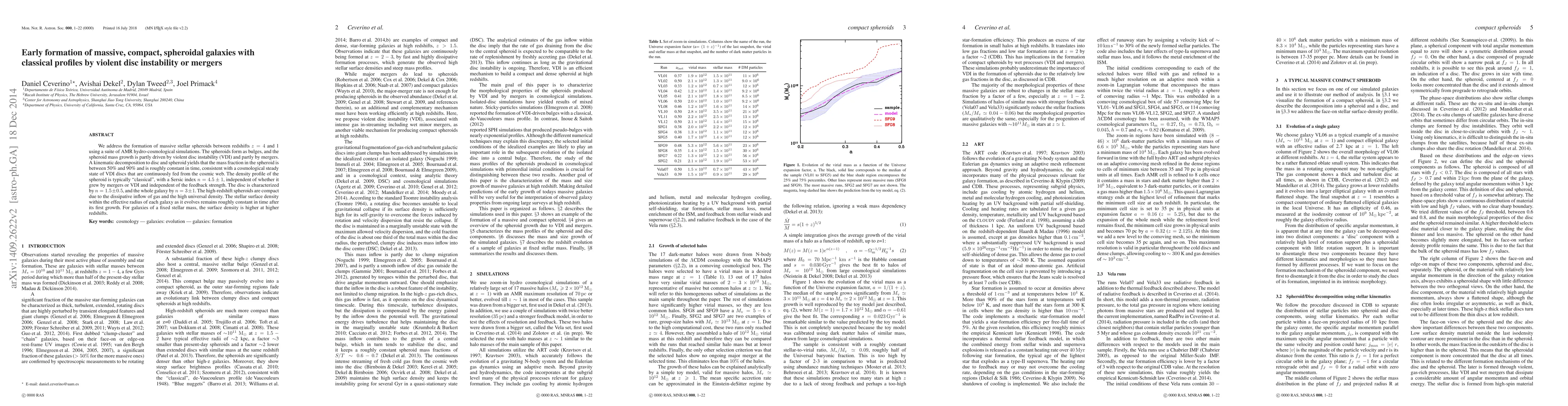 We address the formation of massive stellar spheroids between redshifts $z=4$ and 1 using a suite of AMR hydro-cosmological simulations. The spheroids form as bulges, and the spheroid mass growth is partly driven by violent disc instability (VDI) and partly by mergers. A kinematic decomposition to disc and spheroid yields that the mass fraction in the spheroid is between 50\% and 90\% and is roughly constant in time, consistent with a cosmological steady state of VDI discs that are continuously fed from the cosmic web. The density profile of the spheroid is typically "classical", with a Sersic index $n = 4.5\pm 1$, independent of whether it grew by mergers or VDI and independent of the feedback strength. The disc is characterized by $n=1.5\pm 0.5$, and the whole galaxy by $n=3\pm 1$. The high-redshift spheroids are compact due to the dissipative inflow of gas and the high universal density. The stellar surface density within the effective radius of each galaxy as it evolves remains roughly constant in time after its first growth. For galaxies of a fixed stellar mass, the surface density is higher at higher redshifts.