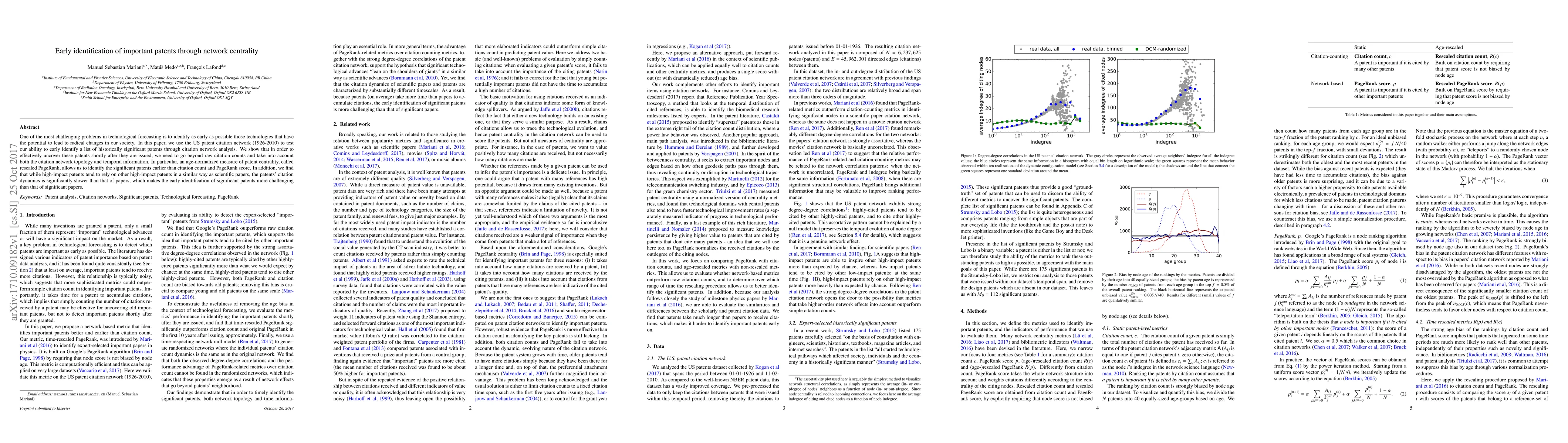This paper proposes using rescaled PageRank, an age-normalized measure of patent centrality, to identify historically significant patents earlier in their lifecycle compared to traditional citation counts and PageRank. It highlights the slower citation dynamics of patents compared to scientific papers, complicating the early identification of significant patents.