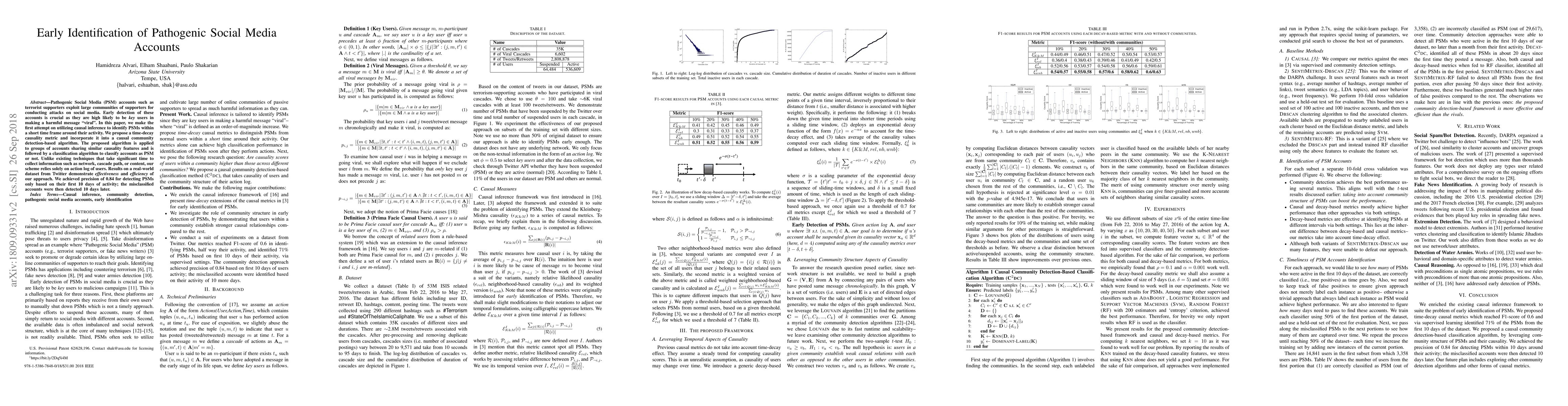 Pathogenic Social Media (PSM) accounts such as terrorist supporters exploit large communities of supporters for conducting attacks on social media. Early detection of these accounts is crucial as they are high likely to be key users in making a harmful message "viral". In this paper, we make the first attempt on utilizing causal inference to identify PSMs within a short time frame around their activity. We propose a time-decay causality metric and incorporate it into a causal community detection-based algorithm. The proposed algorithm is applied to groups of accounts sharing similar causality features and is followed by a classification algorithm to classify accounts as PSM or not. Unlike existing techniques that take significant time to collect information such as network, cascade path, or content, our scheme relies solely on action log of users. Results on a real-world dataset from Twitter demonstrate effectiveness and efficiency of our approach. We achieved precision of 0.84 for detecting PSMs only based on their first 10 days of activity; the misclassified accounts were then detected 10 days later.