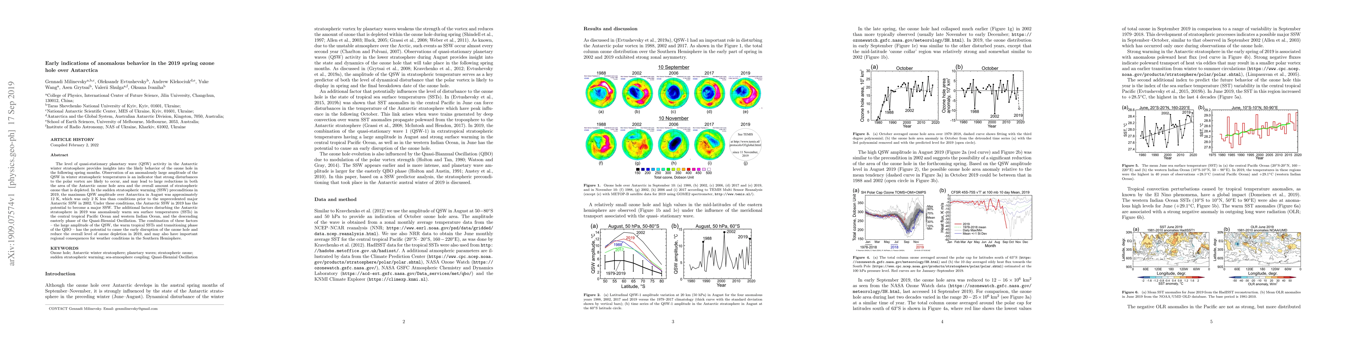 The 2019 Antarctic spring ozone hole may experience anomalous behavior due to high quasi-stationary planetary wave activity, warm tropical sea surface temperatures, and the descending easterly phase of the Quasi-Biennial Oscillation, potentially leading to significant disruptions and reduced ozone depletion. These conditions may also influence Southern Hemisphere weather patterns.