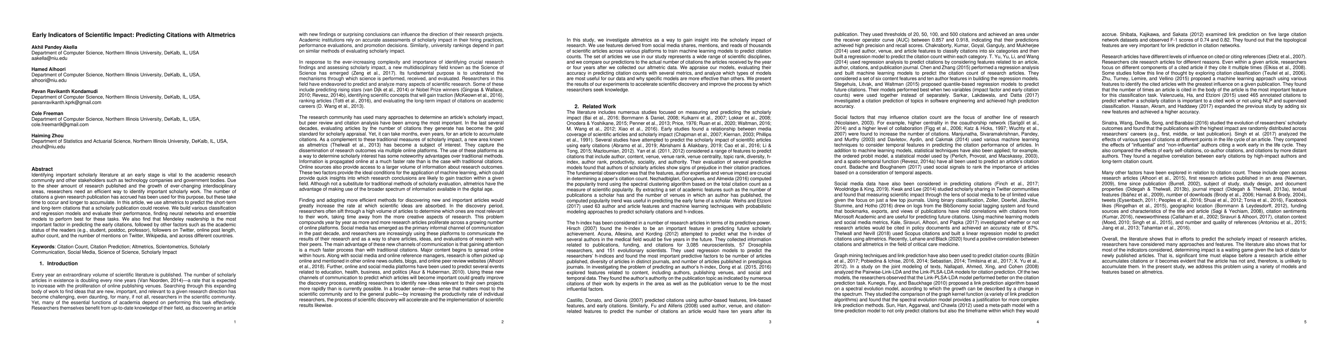 This research explores the use of altmetrics to predict the citation impact of scholarly publications early in their lifecycle. It finds that Mendeley readership and various social media factors, particularly Twitter, are the most significant indicators, with neural networks and ensemble models proving most effective in citation prediction.