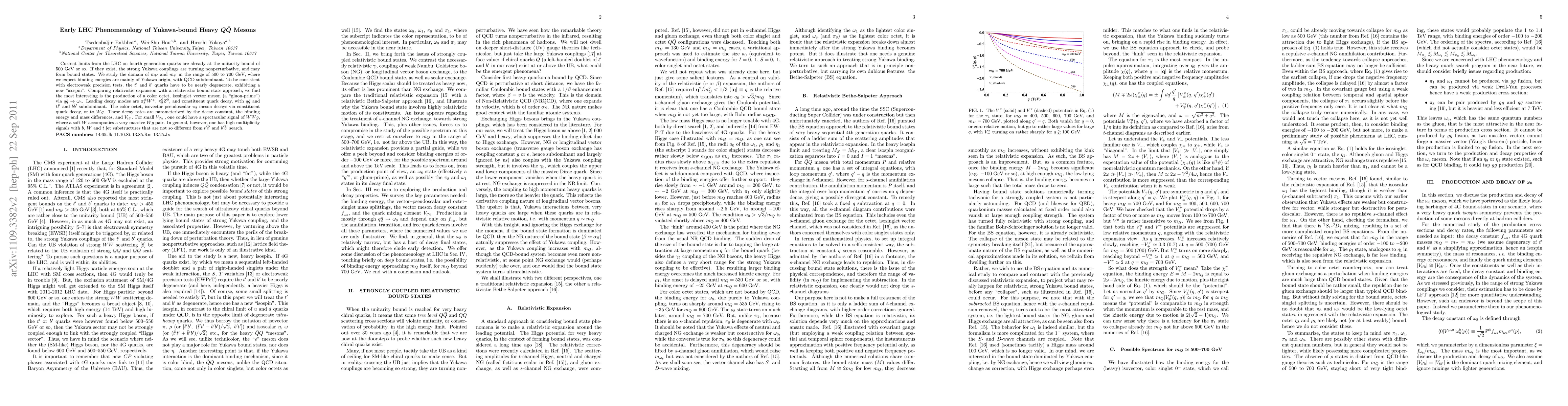 Current limits from the LHC on fourth generation quarks are already at the unitarity bound of 500 GeV or so. If they exist, the strong Yukawa couplings are turning nonperturbative, and may form bound states. We study the domain of m_{b'} and m_{t'} in the range of 500 to 700 GeV, where we expect binding energies are mainly of Yukawa origin, with QCD subdominant. To be consistent with electroweak precision tests, the t' and b' quarks have to be nearly degenerate, exhibiting a new "isospin". Comparing relativistic expansion with a relativistic bound state approach, we find the most interesting is the production of a color octet, isosinglet vector meson (a "gluon-prime") via q\bar{q} to \omega_8. Leading decay modes are \pi_8^\pm W^\mp, \pi_8^0Z^0, and constituent quark decay, with q\bar{q} and t\bar{t}' and b\bar{b}' subdominant. The color octet, isovector pseudoscalar \pi_8 meson decays via constituent quark decay, or to Wg. These decay rates are parameterized by the decay constant, the binding energy and mass differences, and V_{tb'}. For small V_{t'b}, one could have a spectacular signal of WWg, where a soft W accompanies a very massive Wg pair. In general, however, one has high multiplicity signals with b, W and t jet substructures that are not so different from t'\bar{t}' and b'\bar{b}' search.