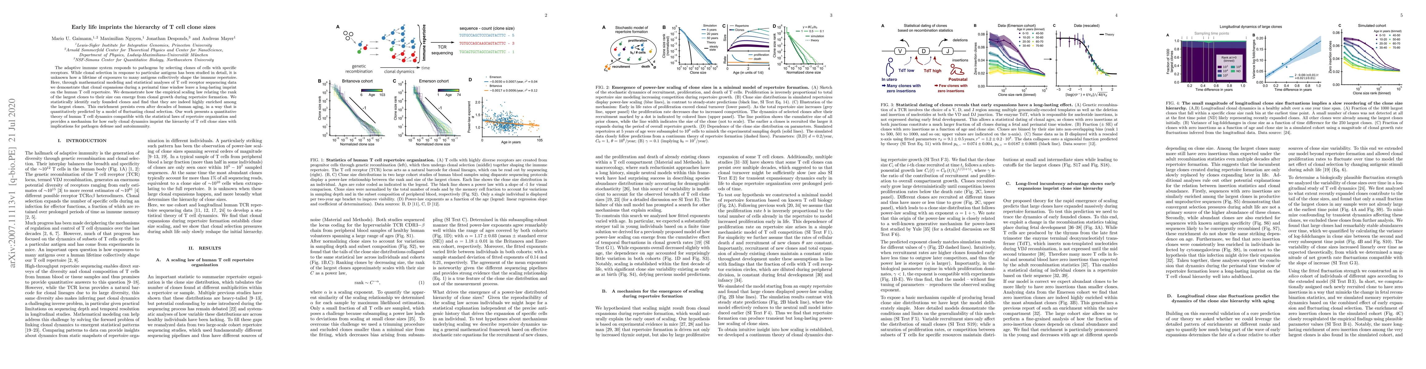 The adaptive immune system responds to pathogens by selecting clones of cells with specific receptors. While clonal selection in response to particular antigens has been studied in detail, it is unknown how a lifetime of exposures to many antigens collectively shape the immune repertoire. Here, through mathematical modeling and statistical analyses of T cell receptor sequencing data we demonstrate that clonal expansions during a perinatal time window leave a long-lasting imprint on the human T cell repertoire. We demonstrate how the empirical scaling law relating the rank of the largest clones to their size can emerge from clonal growth during repertoire formation. We statistically identify early founded clones and find that they are indeed highly enriched among the largest clones. This enrichment persists even after decades of human aging, in a way that is quantitatively predicted by a model of fluctuating clonal selection. Our work presents a quantitative theory of human T cell dynamics compatible with the statistical laws of repertoire organization and provides a mechanism for how early clonal dynamics imprint the hierarchy of T cell clone sizes with implications for pathogen defense and autoimmunity.