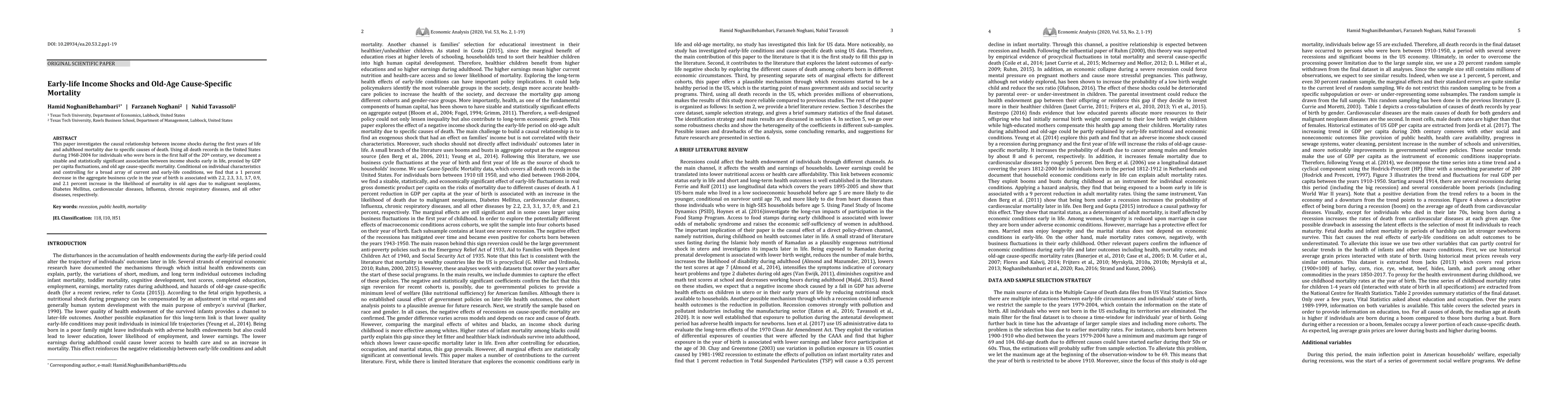 This study examines the impact of early-life income shocks on old-age mortality from specific causes using U.S. death records from 1968-2004. It finds a significant correlation between adverse economic conditions at birth and increased mortality risks later in life from diseases like cancer, diabetes, cardiovascular issues, influenza, and chronic respiratory diseases.