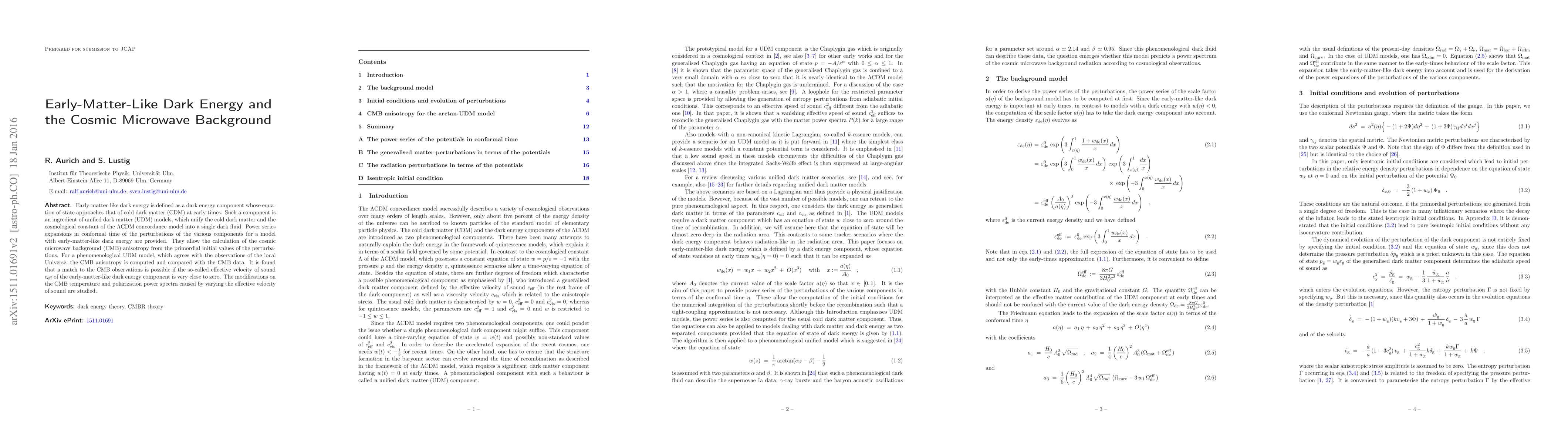 Early-matter-like dark energy is defined as a dark energy component whose equation of state approaches that of cold dark matter (CDM) at early times. Such a component is an ingredient of unified dark matter (UDM) models, which unify the cold dark matter and the cosmological constant of the LambdaCDM concordance model into a single dark fluid. Power series expansions in conformal time of the perturbations of the various components for a model with early-matter-like dark energy are provided. They allow the calculation of the cosmic microwave background (CMB) anisotropy from the primordial initial values of the perturbations. For a phenomenological UDM model, which agrees with the observations of the local Universe, the CMB anisotropy is computed and compared with the CMB data. It is found that a match to the CMB observations is possible if the so-called effective velocity of sound c_eff of the early-matter-like dark energy component is very close to zero. The modifications on the CMB temperature and polarization power spectra caused by varying the effective velocity of sound are studied.