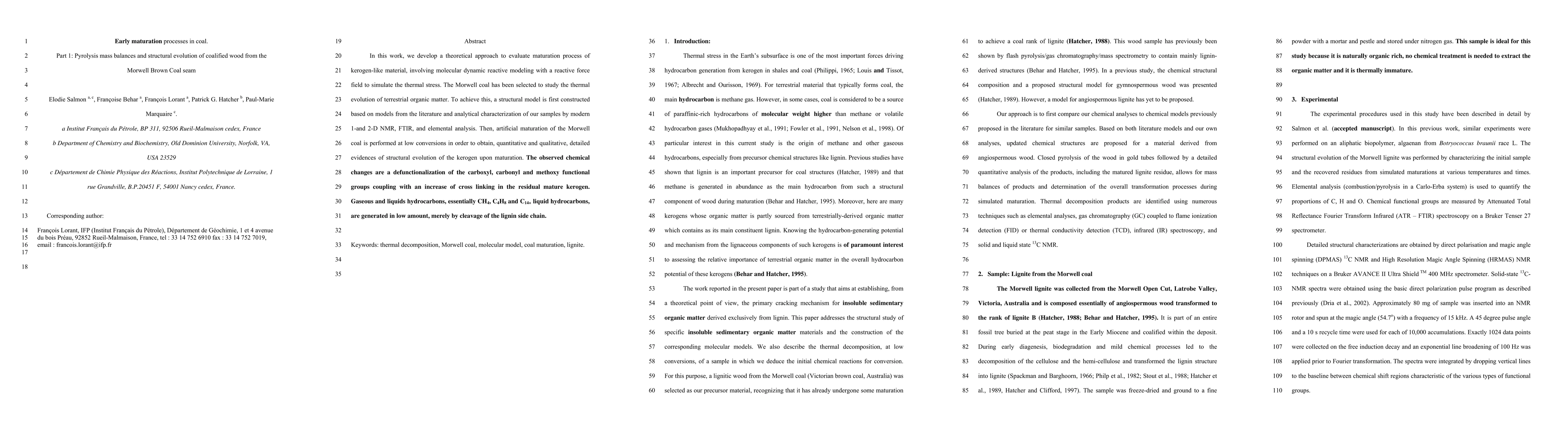 In this work, we develop a theoretical approach to evaluate maturation process of kerogen-like material, involving molecular dynamic reactive modeling with a reactive force field to simulate the thermal stress. The Morwell coal has been selected to study the thermal evolution of terrestrial organic matter. To achieve this, a structural model is first constructed based on models from the literature and analytical characterization of our samples by modern 1-and 2-D NMR, FTIR, and elemental analysis. Then, artificial maturation of the Morwell coal is performed at low conversions in order to obtain, quantitative and qualitative, detailed evidences of structural evolution of the kerogen upon maturation. The observed chemical changes are a defunctionalization of the carboxyl, carbonyl and methoxy functional groups coupling with an increase of cross linking in the residual mature kerogen. Gaseous and liquids hydrocarbons, essentially CH4, C4H8 and C14+ liquid hydrocarbons, are generated in low amount, merely by cleavage of the lignin side chain.
