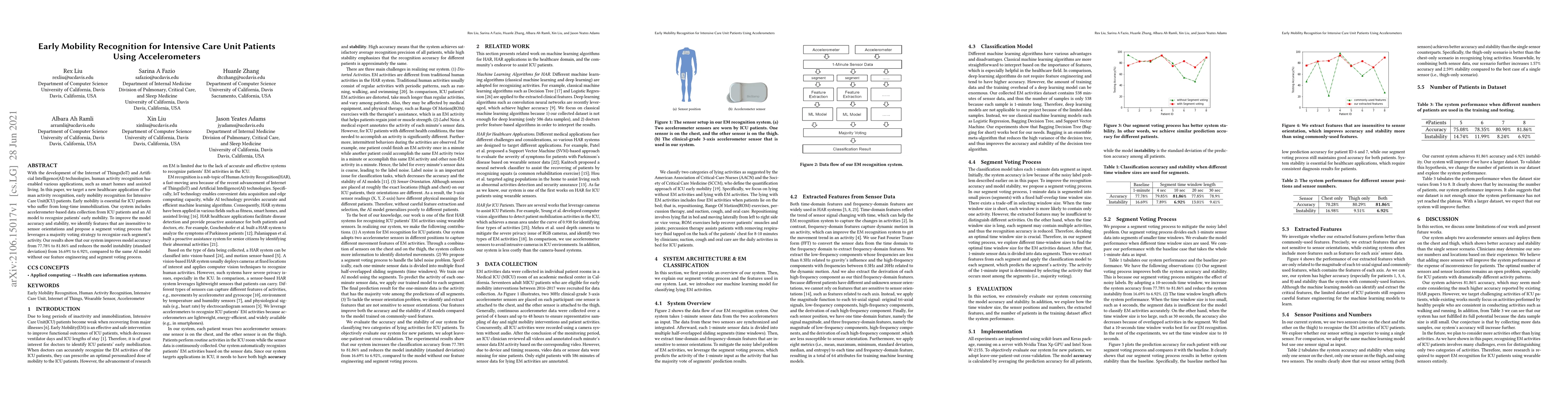 This paper develops an accelerometer-based system using AI to recognize early mobility in ICU patients, improving model accuracy from 77.78% to 81.86% and reducing instability by employing feature engineering and a segment voting strategy.