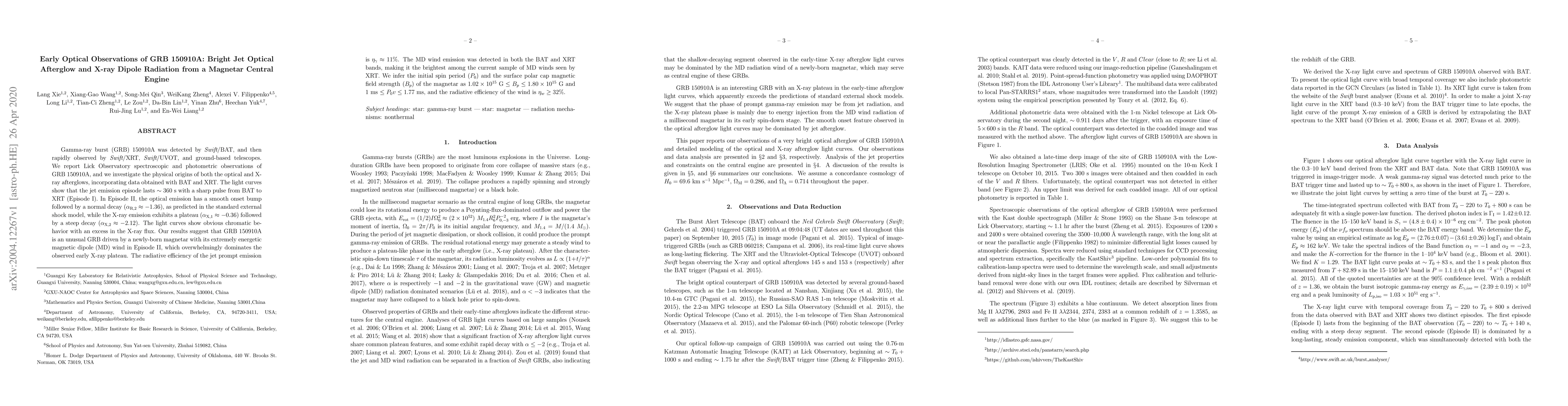The research paper reports on early optical observations of GRB 150910A, revealing a magnetar central engine with an extremely energetic magnetic dipole wind that overwhelms the observed X-ray plateau, suggesting a unique GRB mechanism.