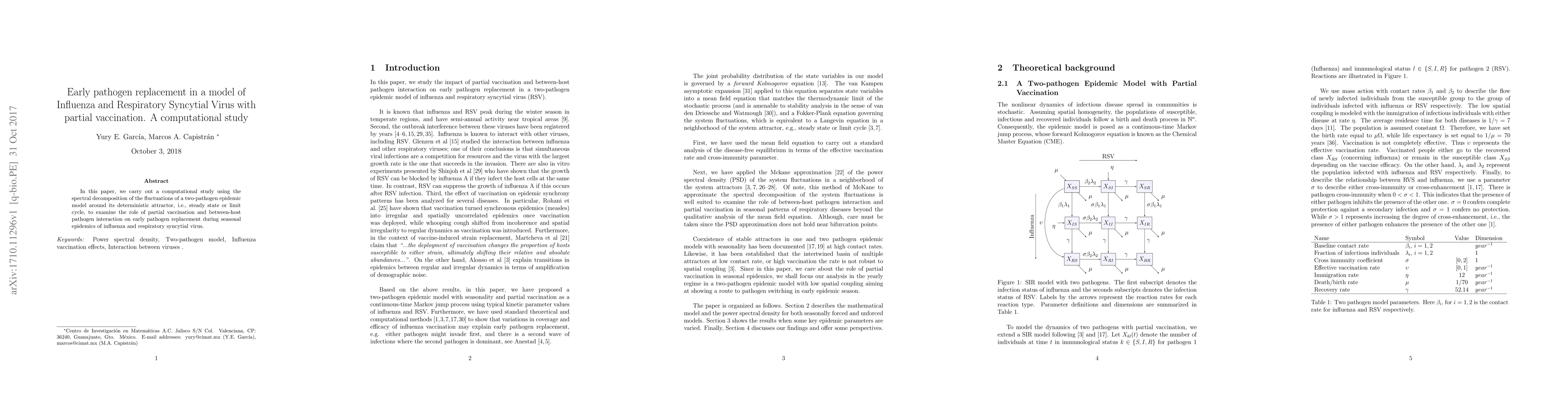 This paper uses computational modeling to study how partial vaccination and pathogen interactions influence the early replacement of influenza and respiratory syncytial virus during seasonal epidemics, employing spectral decomposition to analyze fluctuations around the epidemic's steady state.