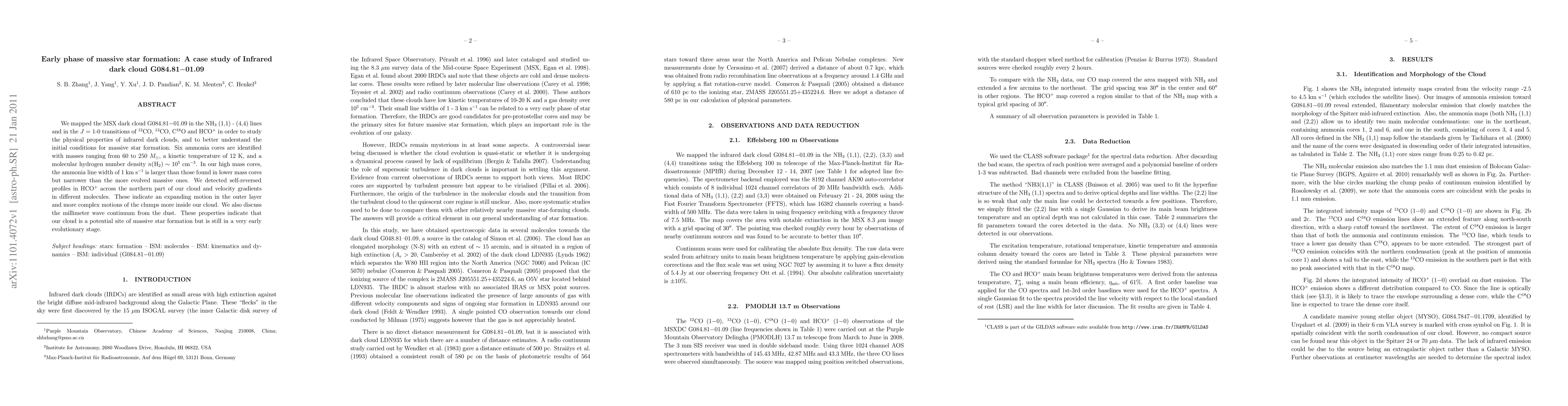 This study maps the infrared dark cloud G084.81-01.09 using NH3 and CO lines to investigate the initial conditions for massive star formation. The cloud contains six ammonia cores with masses up to 250 M_sun, indicating it is an early-stage site for massive star formation with complex internal motions and expanding outer layers.
