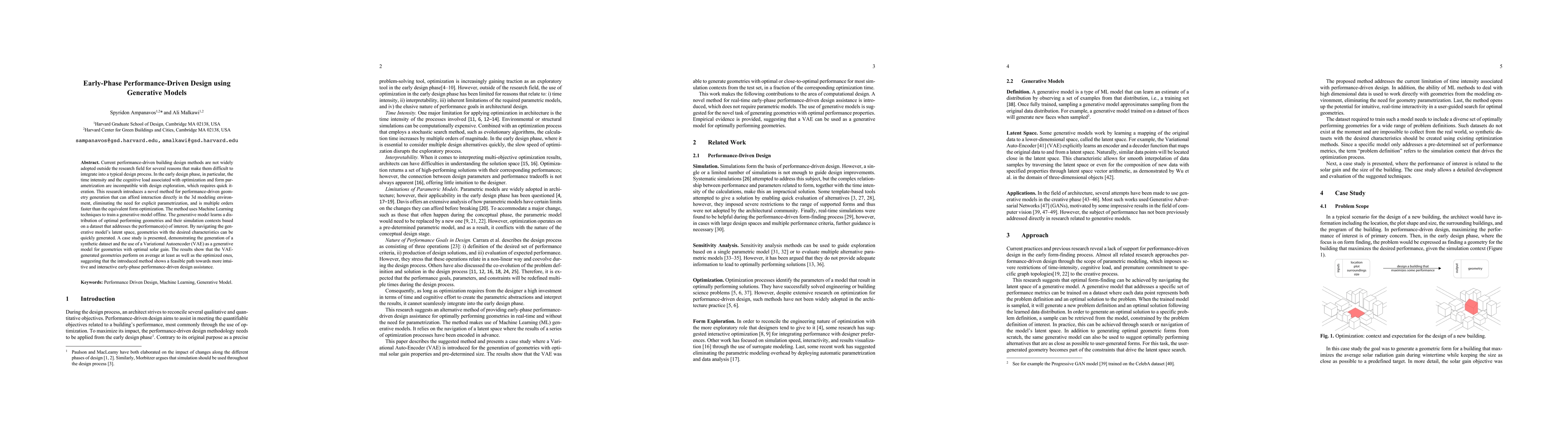 This research proposes a novel method for early-phase performance-driven building design using generative models, which allows for rapid geometry generation and interaction in 3D modeling without the need for explicit parametrization. The method employs a trained Variational Autoencoder (VAE) to quickly generate optimal geometries for desired performance characteristics, demonstrating comparable performance to traditional optimization methods.