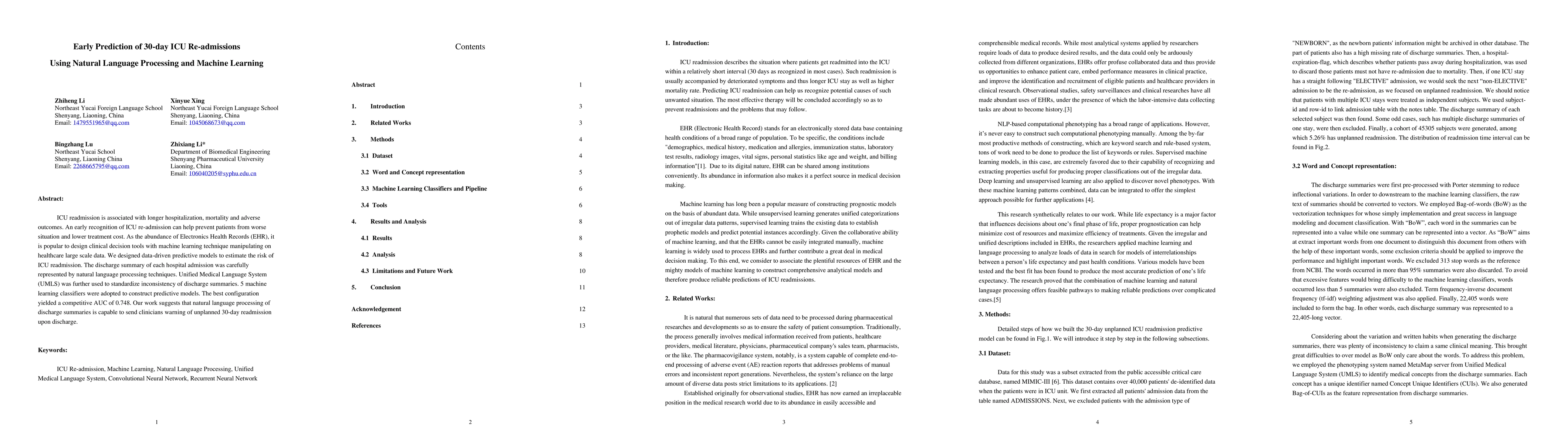 This study develops predictive models using natural language processing and machine learning to estimate the risk of 30-day ICU readmissions based on discharge summaries. The best model achieved an AUC of 0.748, indicating potential for early warning systems to prevent adverse outcomes and reduce treatment costs.