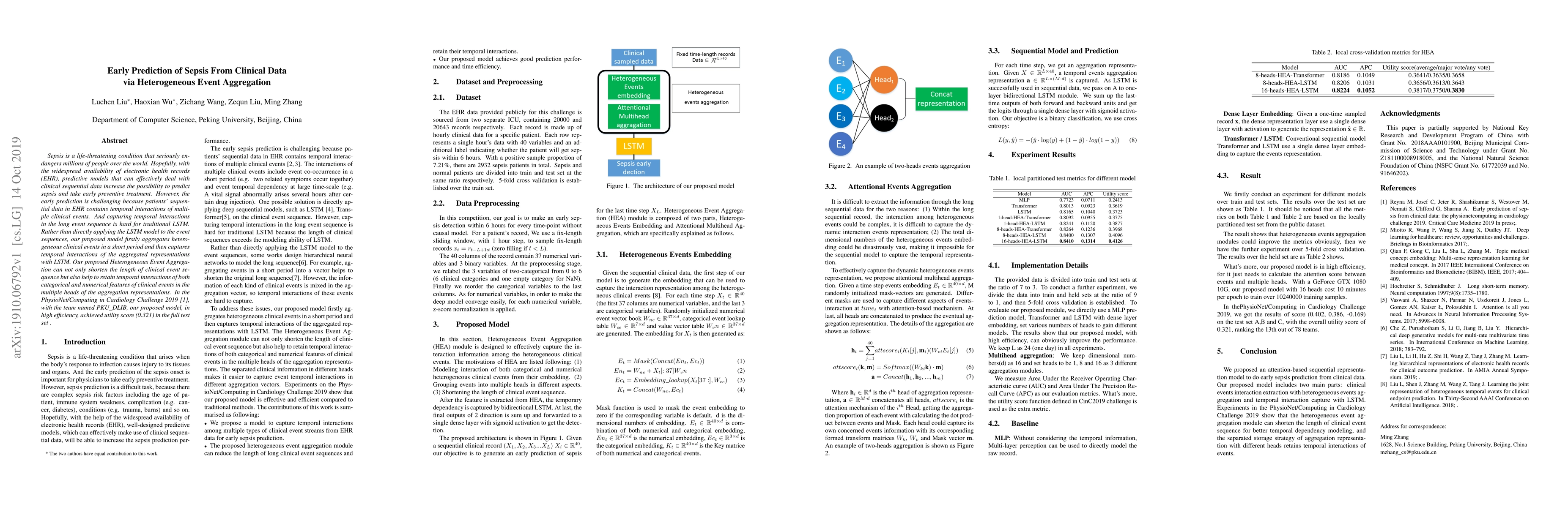 This paper proposes a model for early sepsis prediction using aggregated heterogeneous clinical events from electronic health records. The model aggregates clinical events to shorten sequences and retain temporal interactions, then uses LSTM to capture these interactions, achieving a utility score of 0.321 in the PhysioNet/Computing in Cardiology Challenge 2019.