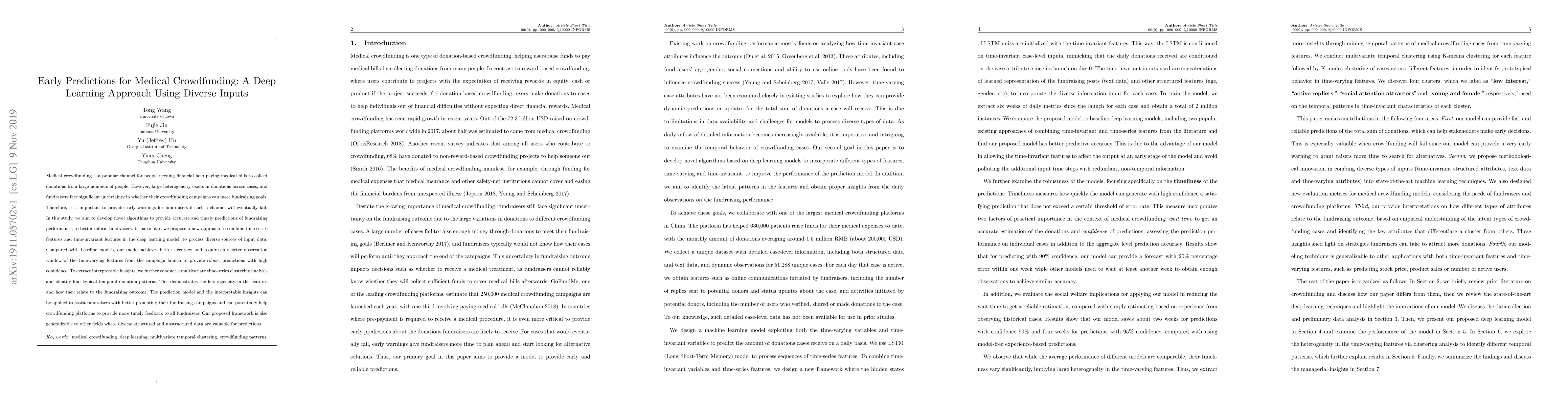 This paper develops a deep learning model combining time-series and time-invariant features to predict medical crowdfunding success early in the campaign. The proposed approach achieves higher accuracy and shorter observation windows compared to baseline models, offering actionable insights and interpretable donation patterns to assist fundraisers.
