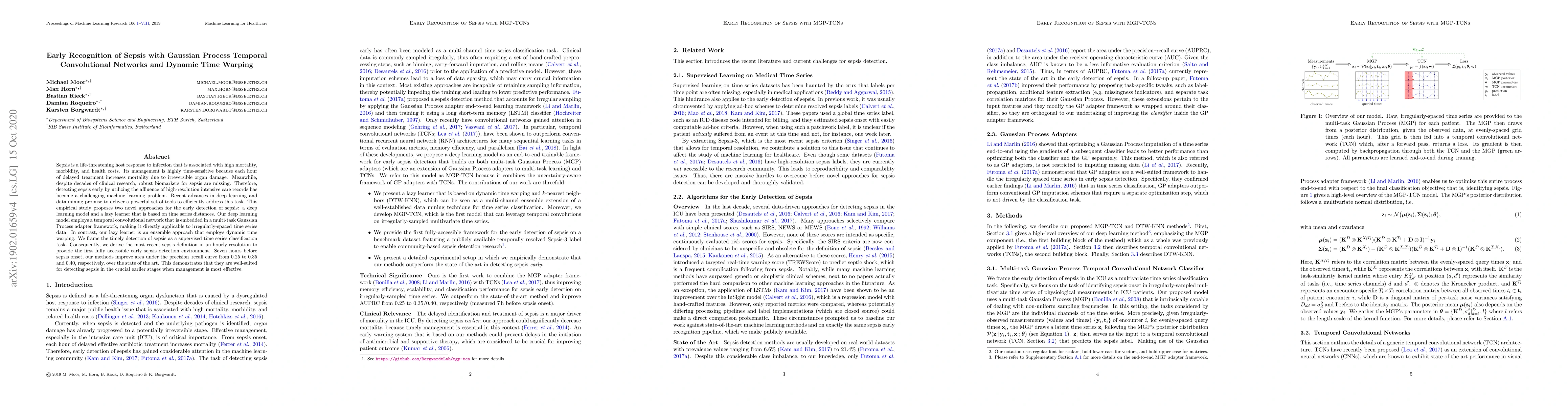 This paper proposes two novel approaches for early sepsis detection using deep learning and time series analysis. The deep learning model employs a temporal convolutional network with a Gaussian Process framework, while the lazy learner uses dynamic time warping. Both methods significantly improve early sepsis detection, enhancing the area under the precision-recall curve by 0.10 to 0.15 hours before onset compared to existing methods.