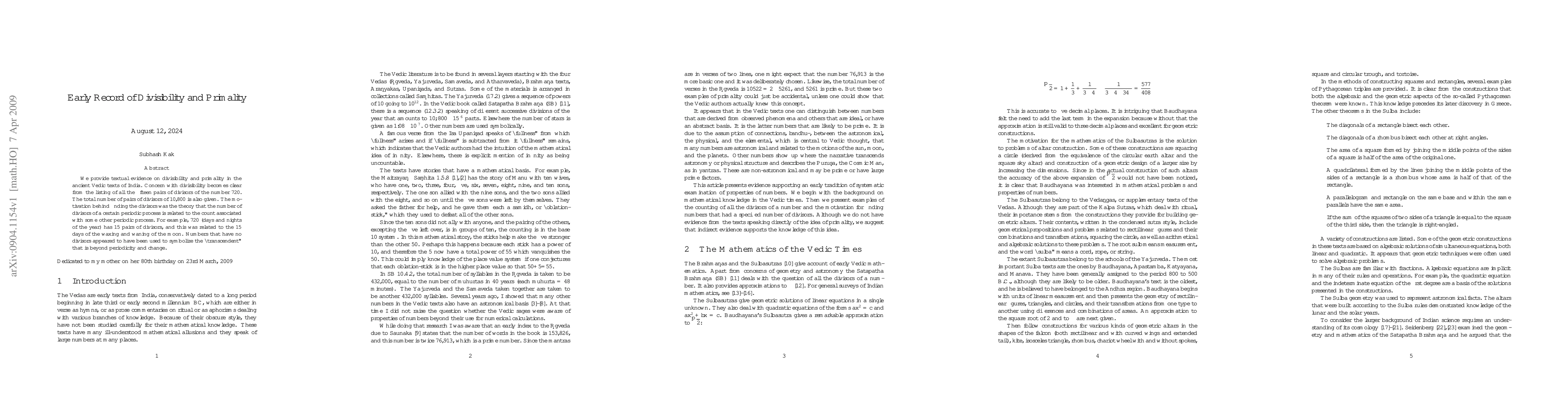 This paper explores ancient Vedic texts to reveal early understanding of divisibility and primality, noting detailed lists of divisor pairs for numbers like 720 and 10,800, and linking these to periodic natural phenomena. Numbers without divisors symbolized the "transcendent" beyond change.