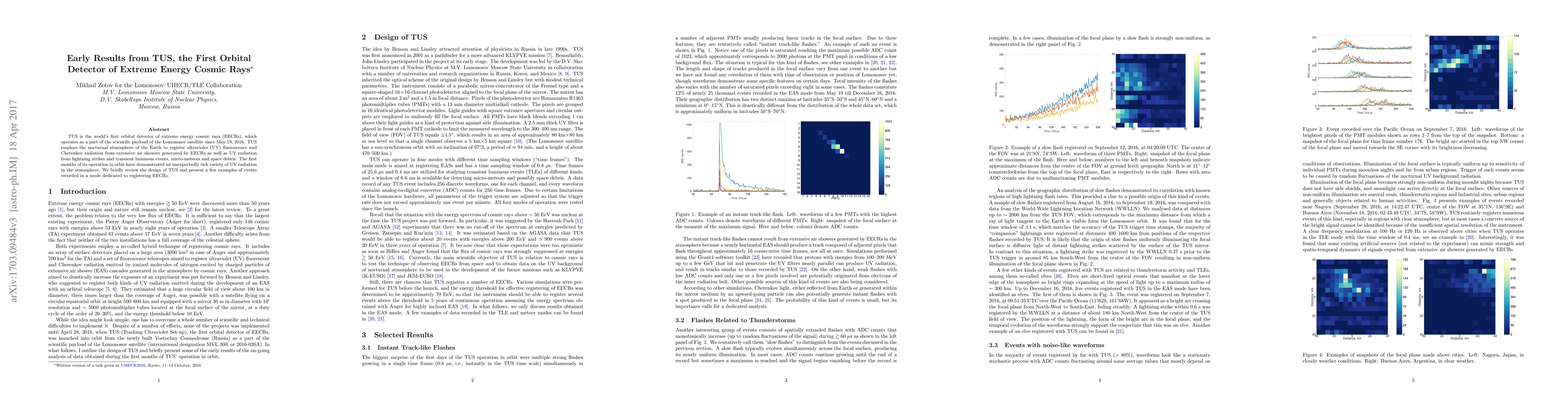 The TUS satellite is the world's first space-based detector aiming to observe ultra-high-energy cosmic rays by capturing UV light from Earth's atmosphere. Initial results reveal a diverse range of atmospheric UV phenomena, demonstrating the instrument's potential to study extreme energy particles from space.
