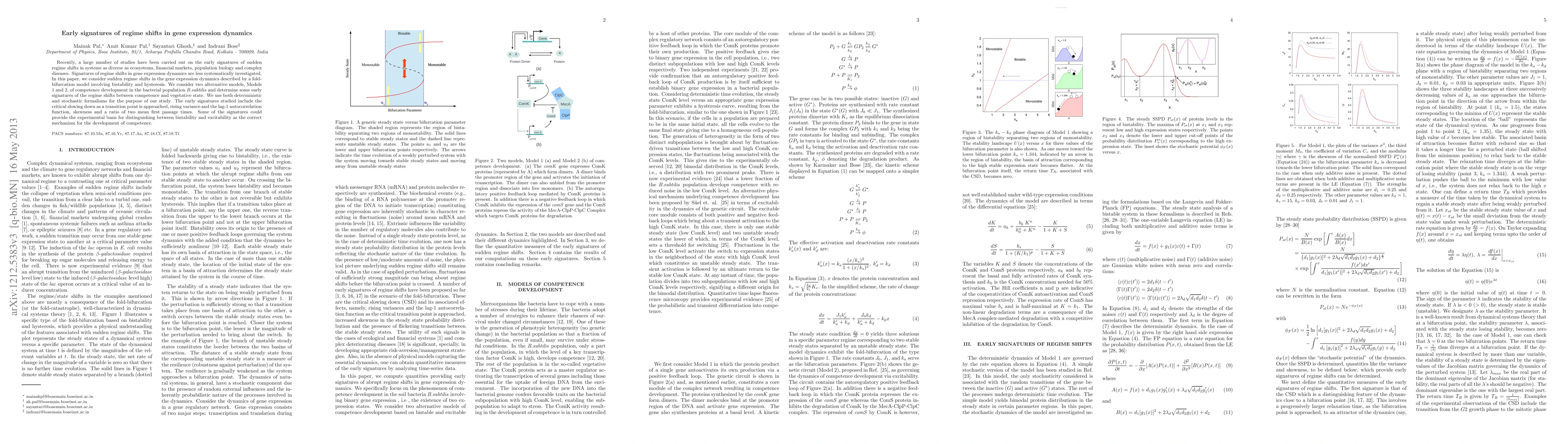 Recently, a large number of studies have been carried out on the early signatures of sudden regime shifts in systems as diverse as ecosystems, financial markets, population biology and complex diseases. Signatures of regime shifts in gene expression dynamics are less systematically investigated. In this paper, we consider sudden regime shifts in the gene expression dynamics described by a fold-bifurcation model involving bistability and hysteresis. We consider two alternative models, Models 1 and 2, of competence development in the bacterial population B. subtilis and determine some early signatures of the regime shifts between competence and noncompetence. We use both deterministic and stochastic formalisms for the purpose of our study. The early signatures studied include the critical slowing down as a transition point is approached, rising variance and the lag-1 autocorrelation function, skewness and a ratio of two mean first passage times. Some of the signatures could provide the experimental basis for distinguishing between bistability and excitability as the correct mechanism for the development of competence.