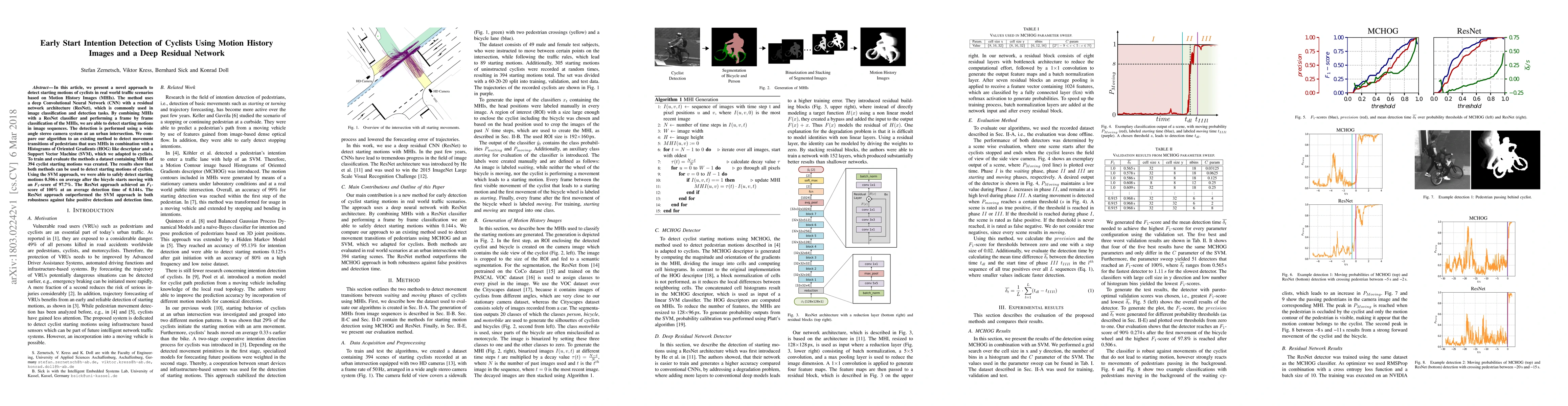 This paper proposes a deep residual network (ResNet) combined with Motion History Images (MHIs) to detect early starting motions of cyclists in urban traffic. The ResNet method outperforms a traditional SVM approach using MHIs and HOG descriptors, achieving an F1-score of 100% and faster detection times, demonstrating improved robustness and efficiency.