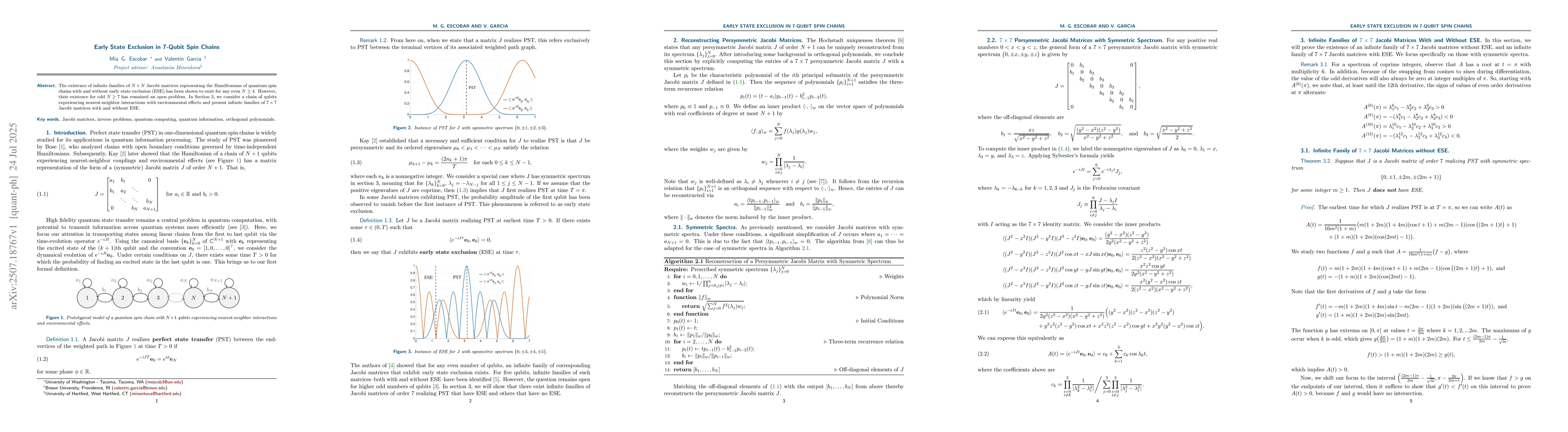The existence of infinite families of $N \times N$ Jacobi matrices representing the Hamiltonians of quantum spin chains with and without early state exclusion (ESE) has been shown to exist for any even $N \geq 4$. However, their existence for odd $N \geq 7$ has remained an open problem. In Section 3, we consider a chain of qubits experiencing nearest-neighbor interactions with environmental effects and present infinite families of $7 \times 7$ Jacobi matrices with and without ESE.