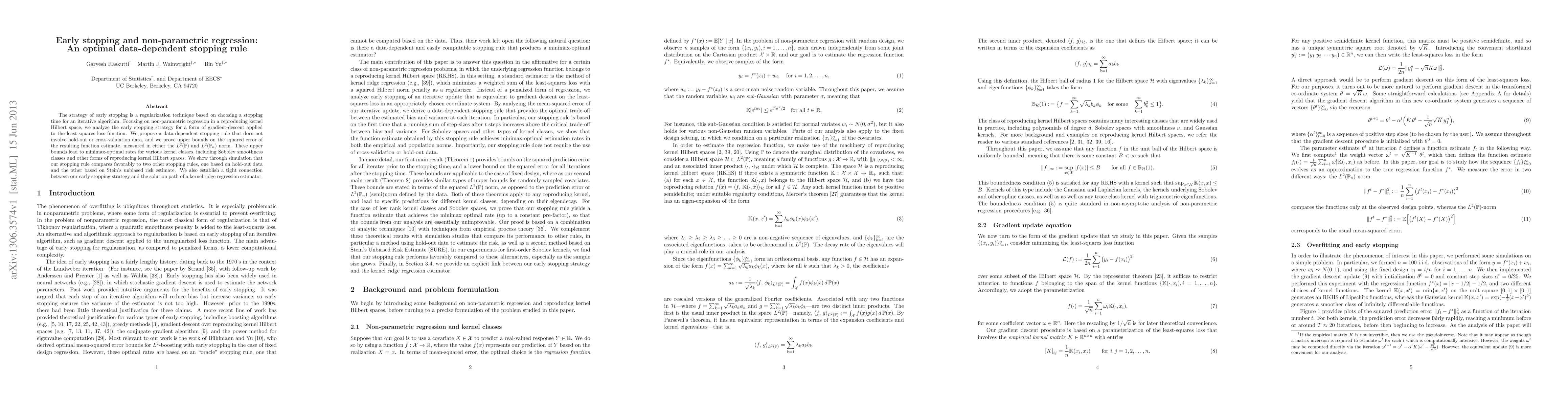 This paper proposes a data-dependent early stopping rule for non-parametric regression in reproducing kernel Hilbert spaces, achieving minimax-optimal rates without requiring hold-out or cross-validation data. Simulation results show its effectiveness compared to traditional methods, and a connection to kernel ridge regression is established.