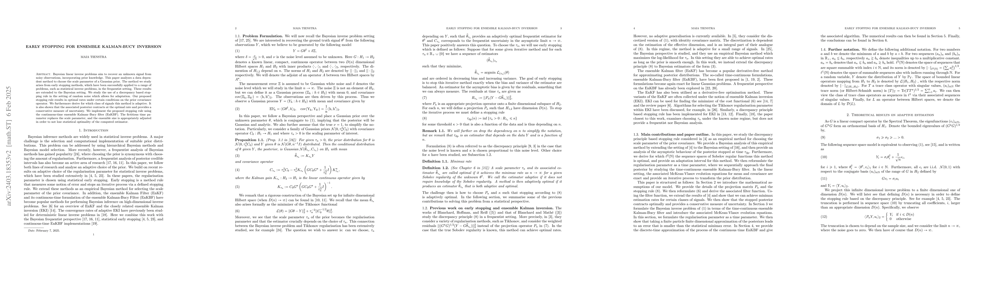 Bayesian linear inverse problems aim to recover an unknown signal from noisy observations, incorporating prior knowledge. This paper analyses a data dependent method to choose the scale parameter of a Gaussian prior. The method we study arises from early stopping methods, which have been successfully applied to a range of problems for statistical inverse problems in the frequentist setting. These results are extended to the Bayesian setting. We study the use of a discrepancy based stopping rule in the setting of random noise. Our proposed stopping rule results in optimal rates under certain conditions on the prior covariance operator. We furthermore derive for which class of signals this method is adaptive. It is also shown that the associated posterior contracts at the optimal rate and provides a conservative measure of uncertainty. We implement the proposed stopping rule using the continuous-time ensemble Kalman--Bucy filter (EnKBF). The fictitious time parameter replaces the scale parameter, and the ensemble size is appropriately adjusted in order to not lose statistical optimality of the computed estimator. The EnKBF, then, gives a continuous process from the prior distribution to the posterior which is terminated using the proposed stopping rule.