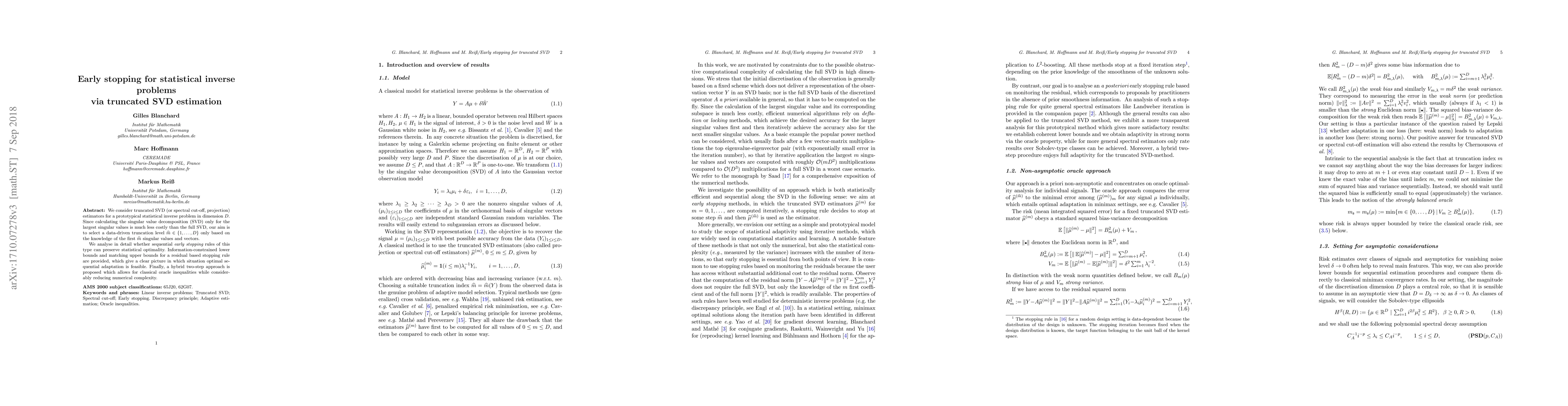 This paper proposes a method to stop early in statistical inverse problems using truncated SVD estimation, aiming to balance computational efficiency with statistical optimality. A hybrid approach combining classical oracle inequalities with adaptive truncation is also introduced to reduce numerical complexity.
