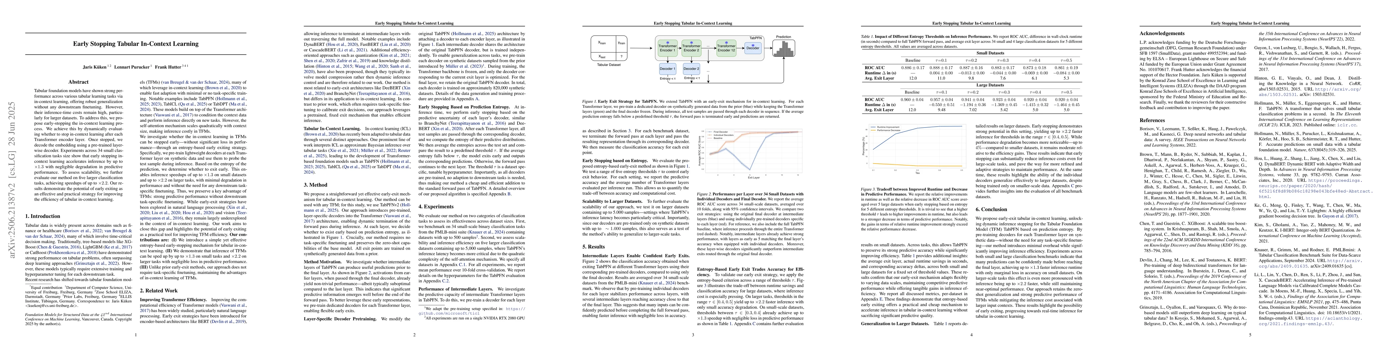 Tabular foundation models have shown strong performance across various tabular learning tasks via in-context learning, offering robust generalization without any downstream finetuning. However, their inference-time costs remain high, particularly for larger datasets. To address this, we propose early-stopping the in-context learning process. We achieve this by dynamically evaluating whether to stop in-context learning after each Transformer encoder layer. Once stopped, we decode the embedding using a pre-trained layer-wise decoder. Experiments across 34 small classification tasks size show that early stopping in-context learning accelerates inference by up to x1.3 with negligible degradation in predictive performance. To assess scalability, we further evaluate our method on five larger classification tasks, achieving speedups of up to x2.2. Our results demonstrate the potential of early exiting as an effective and practical strategy for improving the efficiency of tabular in-context learning.
