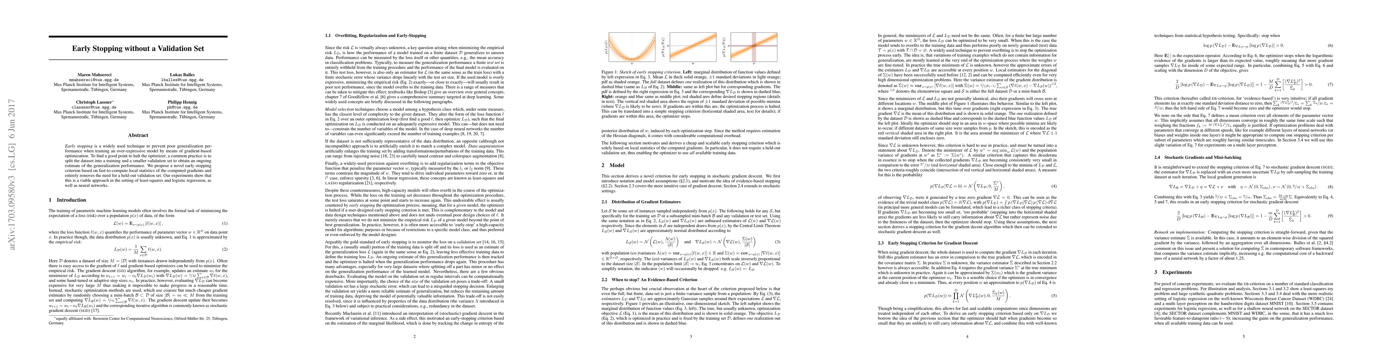 This paper proposes an early stopping method that eliminates the need for a validation set by using fast-to-compute local gradient statistics. Experiments demonstrate its effectiveness in least-squares, logistic regression, and neural network training.