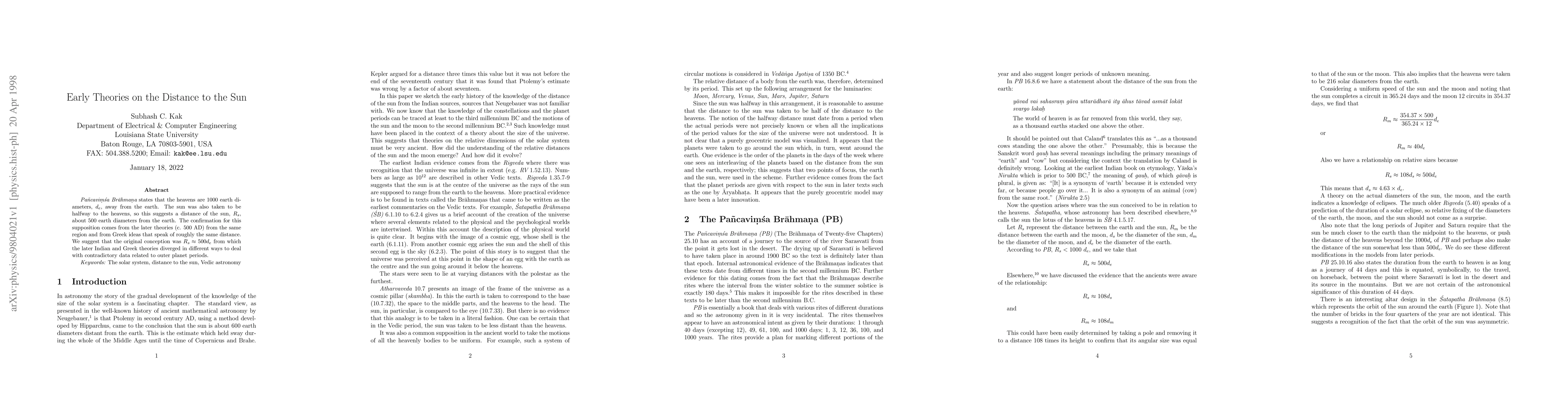 According to an ancient Indian text (c. 1700 BC?), the heavens are 1000 earth diameters away from the earth. Other texts took the sun to be halfway to the heavens, so this suggests a distance of the sun about 500 earth diameters from the earth. The confirmation for this supposition comes from the later theories (c. 500 AD) from the same region and from Greek ideas that speak of roughly the same distance. We suggest that this original conception was transformed by the later Indian and Greek theories in different ways to deal with contradictory data related to outer planet periods.