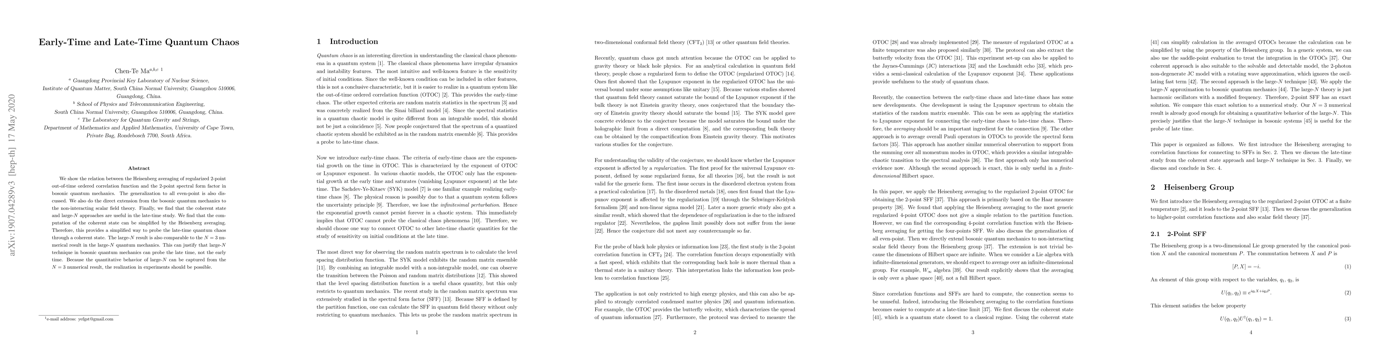 We show the relation between the Heisenberg averaging of regularized 2-point out-of-time ordered correlation function and the 2-point spectral form factor in bosonic quantum mechanics. The generalization to all even-point is also discussed. We also do the direct extension from the bosonic quantum mechanics to the non-interacting scalar field theory. Finally, we find that the coherent state and large-$N$ approaches are useful in the late-time study. We find that the computation of the coherent state can be simplified by the Heisenberg averaging. Therefore, this provides a simplified way to probe the late-time quantum chaos through a coherent state. The large-$N$ result is also comparable to the $N=3$ numerical result in the large-$N$ quantum mechanics. This can justify that large-$N$ technique in bosonic quantum mechanics can probe the late time, not the early time. Because the quantitative behavior of large-$N$ can be captured from the $N=3$ numerical result, the realization in experiments should be possible.