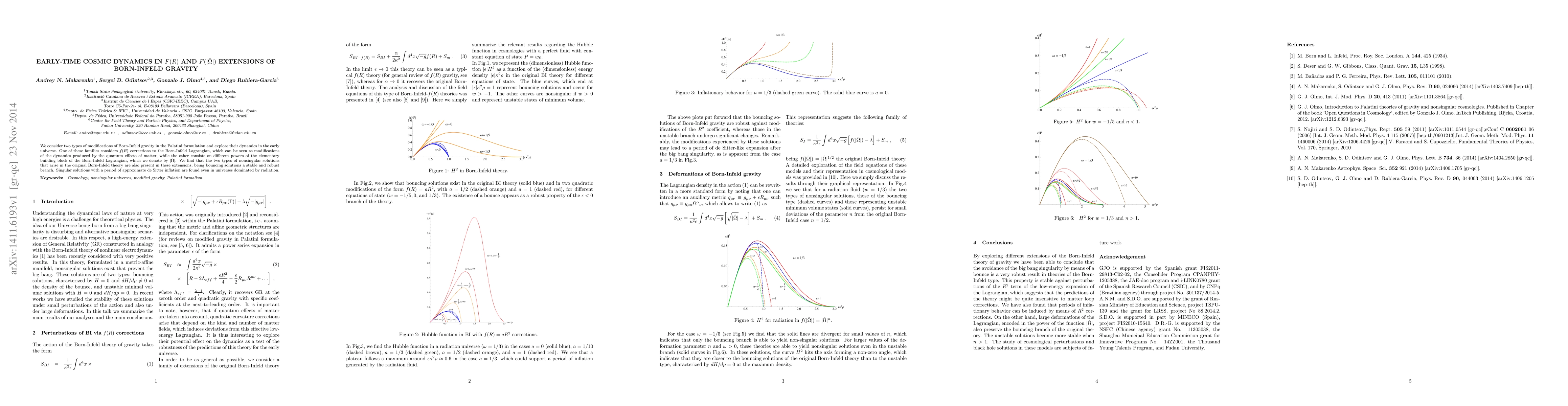 We consider two types of modifications of Born-Infeld gravity in the Palatini formulation and explore their dynamics in the early universe. One of these families considers $f(R)$ corrections to the Born-Infeld Lagrangian, which can be seen as modifications of the dynamics produced by the quantum effects of matter, while the other consists on different powers of the elementary building block of the Born-Infeld Lagrangian, which we denote by $|\hat\Omega|$. We find that the two types of nonsingular solutions that arise in the original Born-Infeld theory are also present in these extensions, being bouncing solutions a stable and robust branch. Singular solutions with a period of approximate de Sitter inflation are found even in universes dominated by radiation.