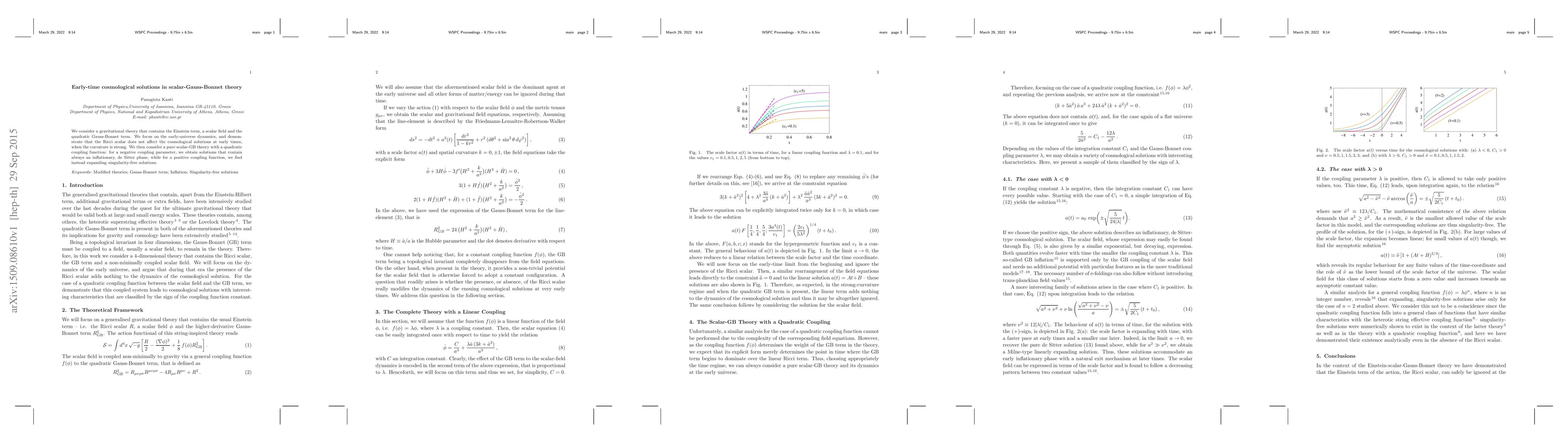 We consider a gravitational theory that contains the Einstein term, a scalar field and the quadratic Gauss-Bonnet term. We focus on the early-universe dynamics, and demonstrate that the Ricci scalar does not affect the cosmological solutions at early times, when the curvature is strong. We then consider a pure scalar-GB theory with a quadratic coupling function: for a negative coupling parameter, we obtain solutions that contain always an inflationary, de Sitter phase, while for a positive coupling function, we find instead expanding singularity-free solutions.