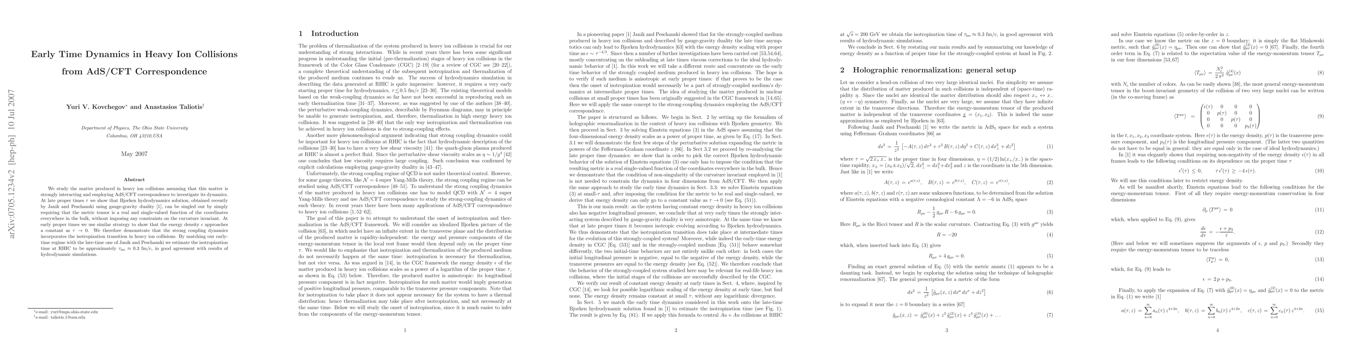 We study the matter produced in heavy ion collisions assuming that this matter is strongly interacting and employing AdS/CFT correspondence to investigate its dynamics. At late proper times we show that Bjorken hydrodynamics solution, obtained recently by Janik and Peschanski using gauge-gravity duality [hep-th/0512162], can be singled out by simply requiring that the metric tensor is a real and single-valued function of the coordinates everywhere in the bulk, without imposing any constraints on the curvature invariant. At early proper times we use similar strategy to show that the energy density approaches a constant as proper time goes to zero. We therefore demonstrate that the strong coupling dynamics incorporates the isotropization transition in heavy ion collisions. By matching our early-time regime with the late-time one of Janik and Peschanski we estimate the isotropization time at RHIC to be approximately 0.3 fm/c, in good agreement with results of hydrodynamic simulations.