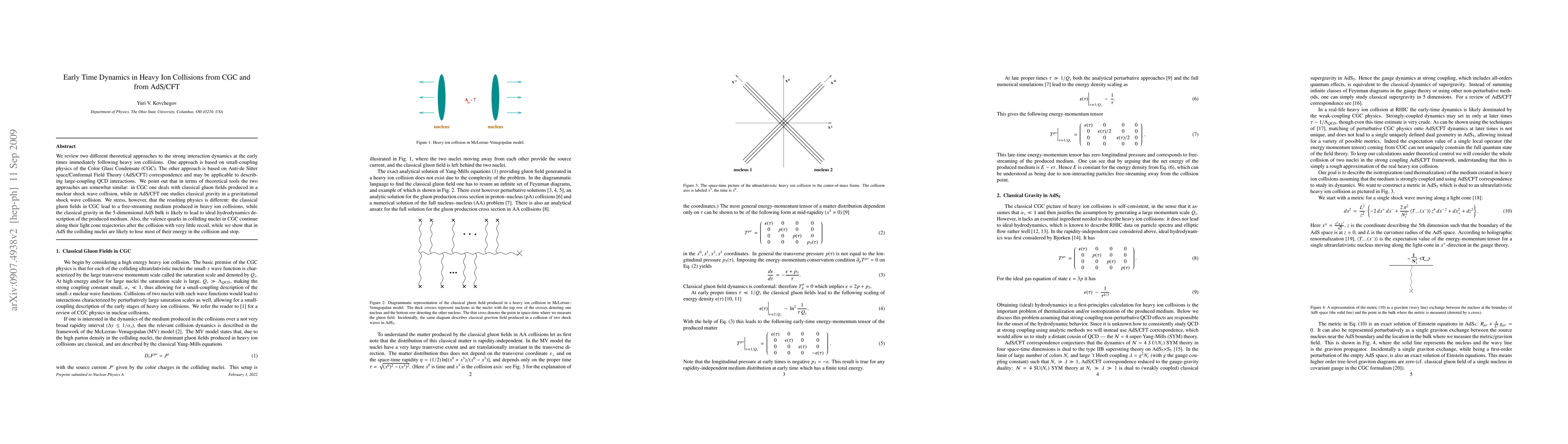 We review two different theoretical approaches to the strong interaction dynamics at the early times immediately following heavy ion collisions. One approach is based on small-coupling physics of the Color Glass Condensate (CGC). The other approach is based on Anti-de Sitter space/Conformal Field Theory (AdS/CFT) correspondence and may be applicable to describing large-coupling QCD interactions. We point out that in terms of theoretical tools the two approaches are somewhat similar: in CGC one deals with classical gluon fields produced in a nuclear shock wave collision, while in AdS/CFT one studies classical gravity in a gravitational shock wave collision. We stress, however, that the resulting physics is different: the classical gluon fields in CGC lead to a free-streaming medium produced in heavy ion collisions, while the classical gravity in the 5-dimensional AdS bulk is likely to lead to ideal hydrodynamics description of the produced medium. Also, the valence quarks in colliding nuclei in CGC continue along their light cone trajectories after the collision with very little recoil, while we show that in AdS the colliding nuclei are likely to lose most of their energy in the collision and stop.