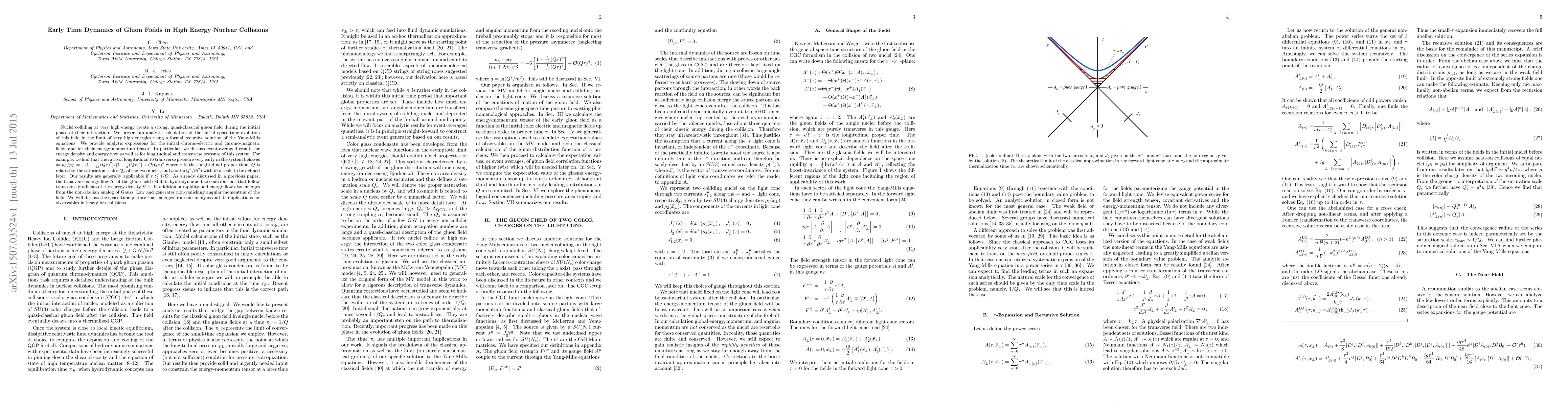 Nuclei colliding at very high energy create a strong, quasi-classical gluon field during the initial phase of their interaction. We present an analytic calculation of the initial space-time evolution of this field in the limit of very high energies using a formal recursive solution of the Yang-Mills equations. We provide analytic expressions for the initial chromo-electric and chromo-magnetic fields and for their energy-momentum tensor. In particular, we discuss event-averaged results for energy density and energy flow as well as for longitudinal and transverse pressure of this system. For example, we find that the ratio of longitudinal to transverse pressure very early in the system behaves as $p_L/p_T = -[1-\frac{3}{2a}(Q\tau)^2]/[1-\frac{1}{a}(Q\tau)^2]+\mathcal{O}(Q\tau)^4$ where $\tau$ is the longitudinal proper time, $Q$ is related to the saturation scales $Q_s$ of the two nuclei, and $a = \ln (Q^2/\hat{m}^2)$ with $\hat m$ a scale to be defined later. Our results are generally applicable if $\tau \lesssim 1/Q$. As already discussed in a previous paper, the transverse energy flow $S^i$ of the gluon field exhibits hydrodynamic-like contributions that follow transverse gradients of the energy density $\nabla^i \varepsilon$. In addition, a rapidity-odd energy flow also emerges from the non-abelian analog of Gauss' Law and generates non-vanishing angular momentum of the field. We will discuss the space-time picture that emerges from our analysis and its implications for observables in heavy ion collisions.