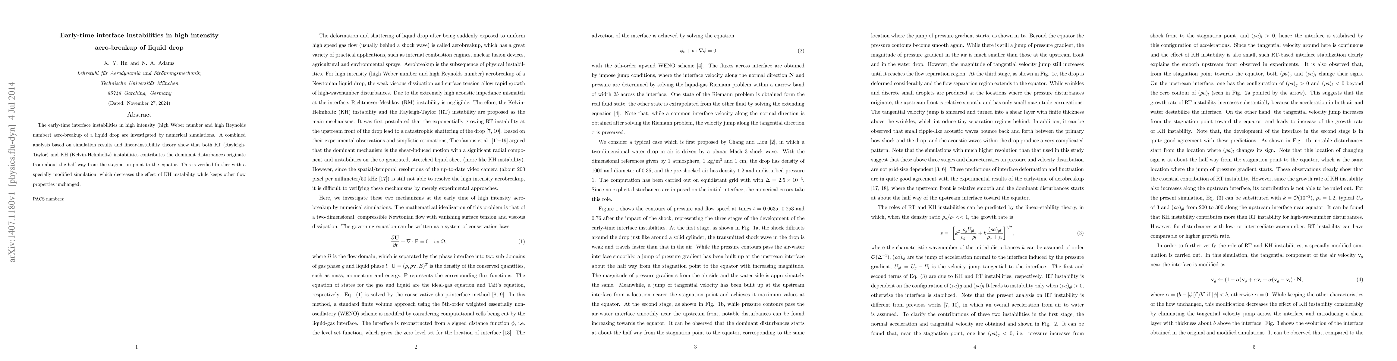 The early-time interface instabilities in high intensity (high Weber number and high Reynolds number) aero-breakup of a liquid drop are investigated by numerical simulations. A combined analysis based on simulation results and linear-instability theory show that both RT (Rayleigh-Taylor) and KH (Kelvin-Helmholtz) instabilities contributes the dominant disturbances originate from about the half way from the stagnation point to the equator. This is verified further with a specially modified simulation, which decreases the effect of KH instability while keeps other flow properties unchanged.
