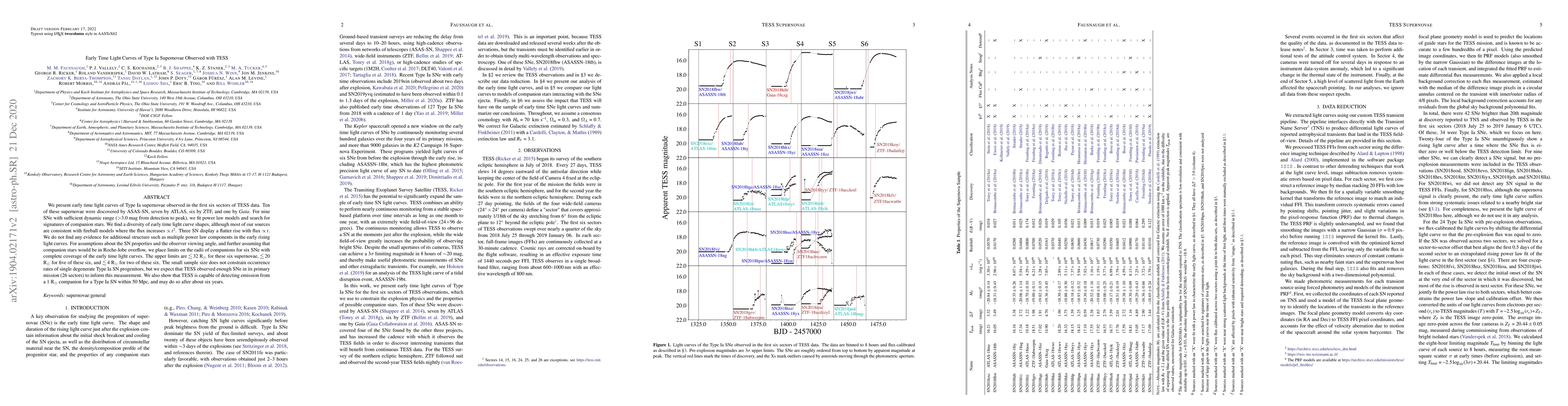 This study presents early light curves of Type Ia supernovae from TESS data, revealing diverse shapes but mostly consistent with fireball models. It finds upper limits on the radii of potential companion stars for six supernovae, suggesting small companion sizes.