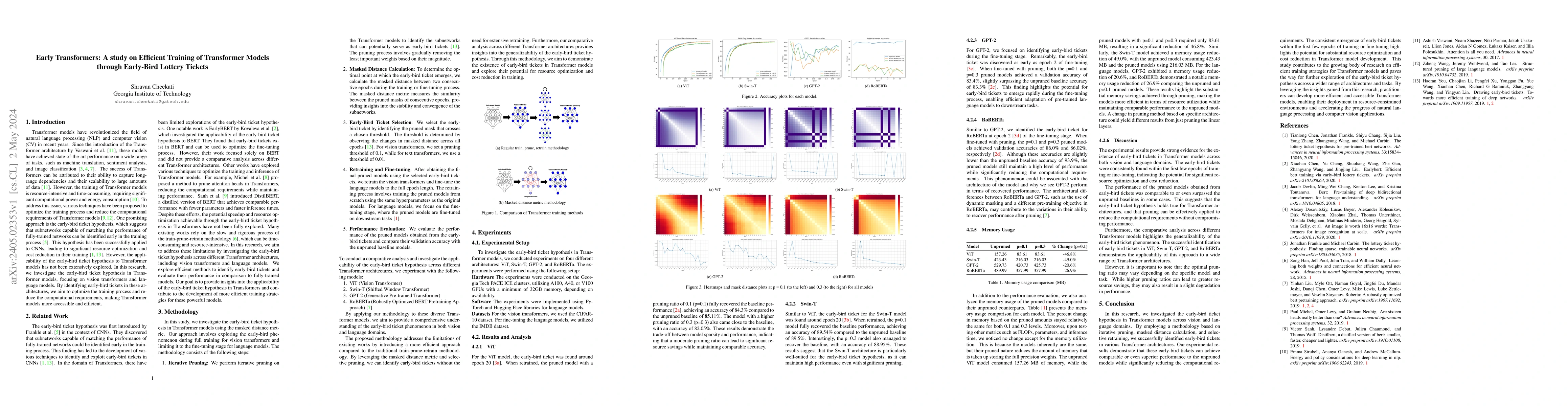 This paper proposes a method combining iterative pruning and masked distance calculation to identify early-bird tickets in Transformer models, demonstrating that significant resource optimization can be achieved without sacrificing performance. The study shows that early-bird tickets, found within the first few training epochs, enable efficient training across various Transformer architectures, leading to reduced memory usage while maintaining or even improving accuracy.