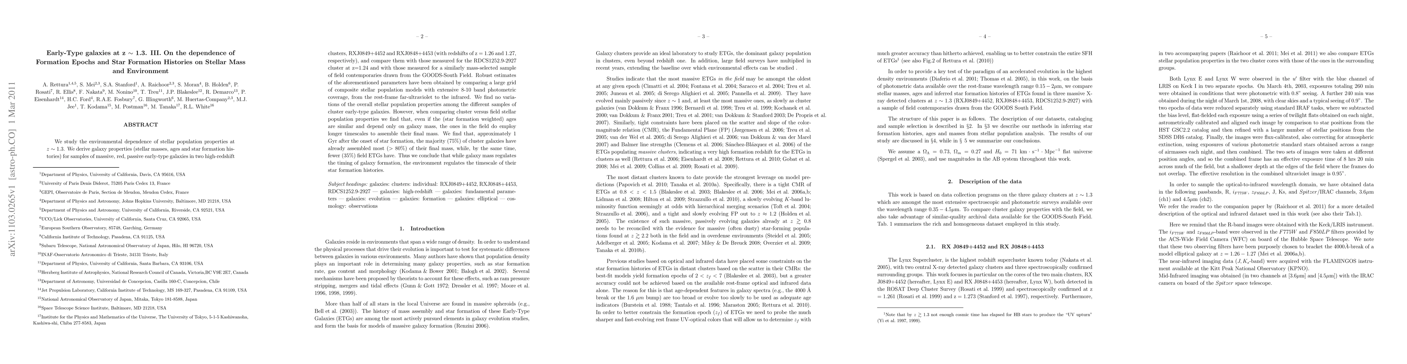 This study investigates the formation epochs and star formation histories of early-type galaxies at z ~ 1.3, finding no significant differences in stellar population properties among cluster galaxies. However, field galaxies exhibit longer timescales for mass assembly, suggesting that while galaxy mass dictates formation timing, the environment influences the duration of star formation history.