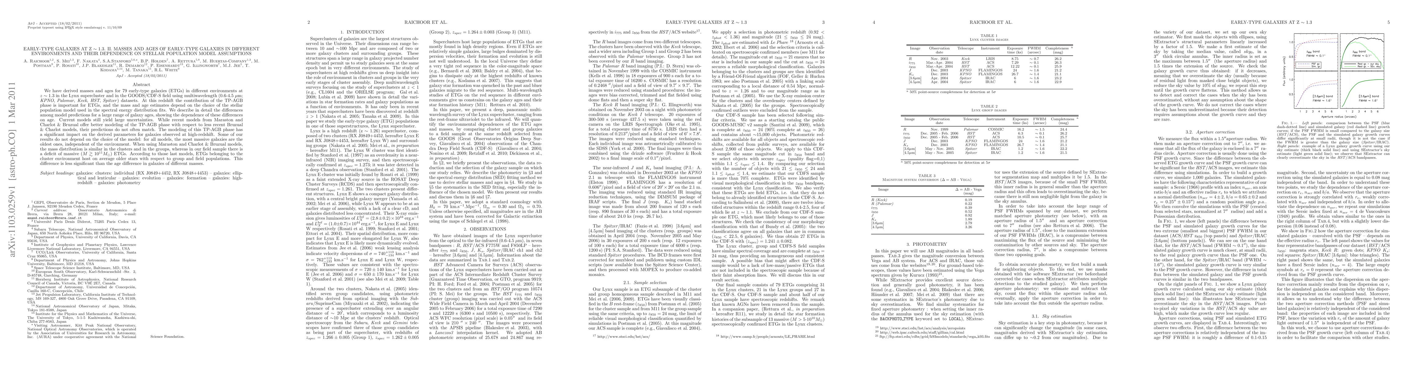 We have derived masses and ages for 79 early-type galaxies (ETGs) in different environments at z~1.3 in the Lynx supercluster and in the GOODS/CDF-S field using multiwavelength (0.6-4.5 $\mu$m; KPNO, Palomar, Keck, HST, Spitzer) datasets. At this redshift the contribution of the TP-AGB phase is important for ETGs, and the mass and age estimates depend on the choice of the stellar population model used in the spectral energy distribution fits. We describe in detail the differences among model predictions for a large range of galaxy ages, showing the dependence of these differences on age. Current models still yield large uncertainties. While recent models from Maraston and Charlot & Bruzual offer better modeling of the TP-AGB phase with respect to less recent Bruzual & Charlot models, their predictions do not often match. The modeling of this TP-AGB phase has a significant impact on the derived parameters for galaxies observed at high-redshift. Some of our results do not depend on the choice of the model: for all models, the most massive galaxies are the oldest ones, independent of the environment. When using Maraston and Charlot & Bruzual models, the mass distribution is similar in the clusters and in the groups, whereas in our field sample there is a deficit of massive (M $\gtrsim$ 10^11 Msun) ETGs. According to those last models, ETGs belonging to the cluster environment host on average older stars with respect to group and field populations. This difference is less significant than the age difference in galaxies of different masses.