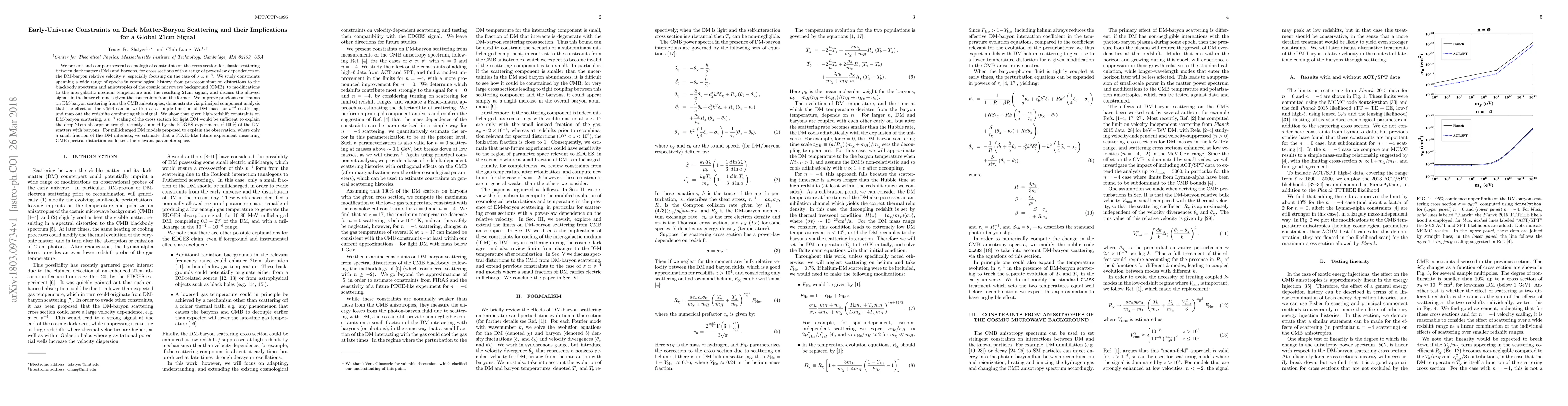 We present and compare several cosmological constraints on the cross section for elastic scattering between dark matter (DM) and baryons, for cross sections with a range of power-law dependences on the DM-baryon relative velocity $v$, especially focusing on the case of $\sigma \propto v^{-4}$. We study constraints spanning a wide range of epochs in cosmological history, from pre-recombination distortions to the blackbody spectrum and anisotropies of the cosmic microwave background (CMB), to modifications to the intergalactic medium temperature and the resulting 21cm signal, and discuss the allowed signals in the latter channels given the constraints from the former. We improve previous constraints on DM-baryon scattering from the CMB anisotropies, demonstrate via principal component analysis that the effect on the CMB can be written as a simple function of DM mass, and map out the redshifts dominating this signal. We show that given high-redshift constraints on DM-baryon scattering, a $v^{-4}$ scaling of the cross section for light DM would be sufficient to explain the deep 21cm absorption trough recently claimed by the EDGES experiment, if 100% of the DM scatters with baryons. For millicharged DM models proposed to explain the observation, where only a small fraction of the DM interacts, we estimate that a PIXIE-like future experiment measuring CMB spectral distortion could test the relevant parameter space.