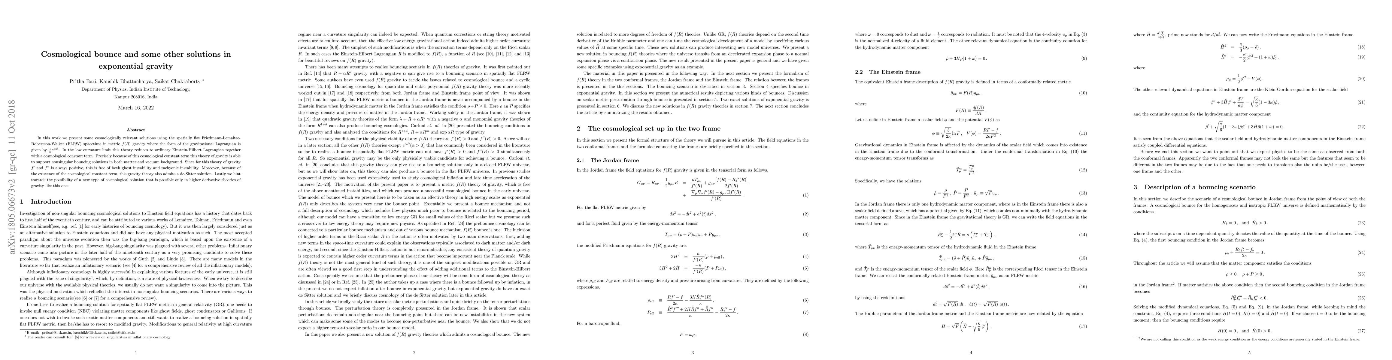 This paper presents cosmological solutions in a new theory of gravity that includes an exponential form of the gravitational Lagrangian, allowing for nonsingular bouncing solutions and de-Sitter solutions.