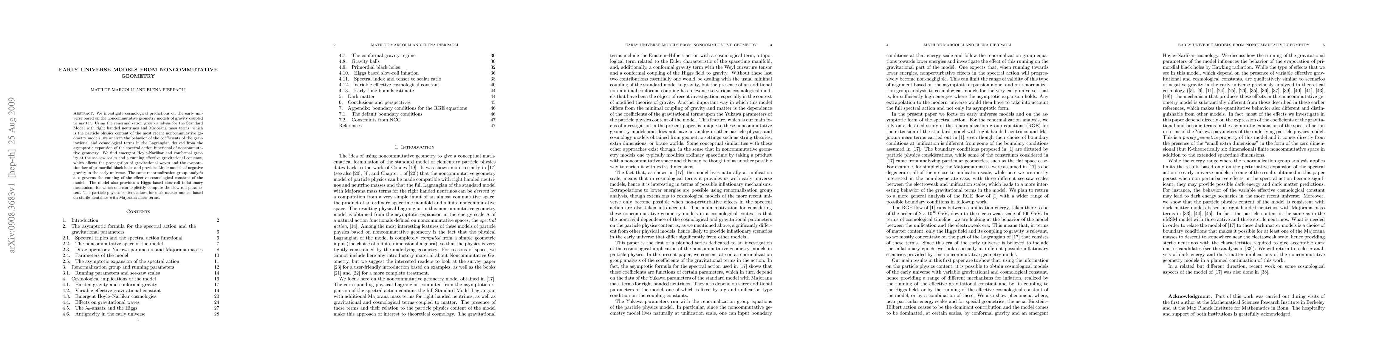 This paper explores early universe models derived from noncommutative geometry, revealing emergent gravity theories and a running gravitational constant that influence gravitational wave propagation and primordial black hole evaporation. It also proposes a Higgs-based inflationary mechanism and dark matter models involving sterile neutrinos.