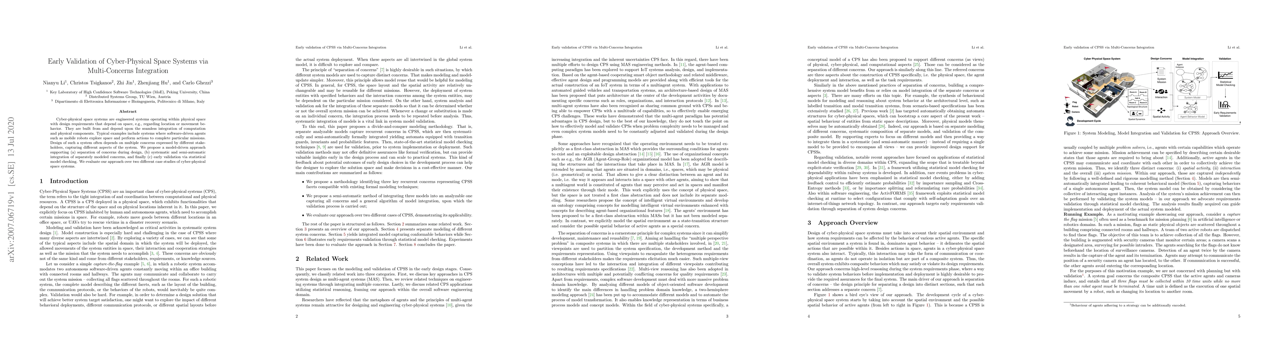 Cyber-physical space systems are engineered systems operating within physical space with design requirements that depend on space, e.g., regarding location or movement behavior. They are built from and depend upon the seamless integration of computation and physical components. Typical examples include systems where software-driven agents such as mobile robots explore space and perform actions to complete particular missions. Design of such a system often depends on multiple concerns expressed by different stakeholders, capturing different aspects of the system. We propose a model-driven approach supporting (a) separation of concerns during design, (b) systematic and semi-automatic integration of separately modeled concerns, and finally (c) early validation via statistical model checking. We evaluate our approach over two different case studies of cyber-physical space systems.