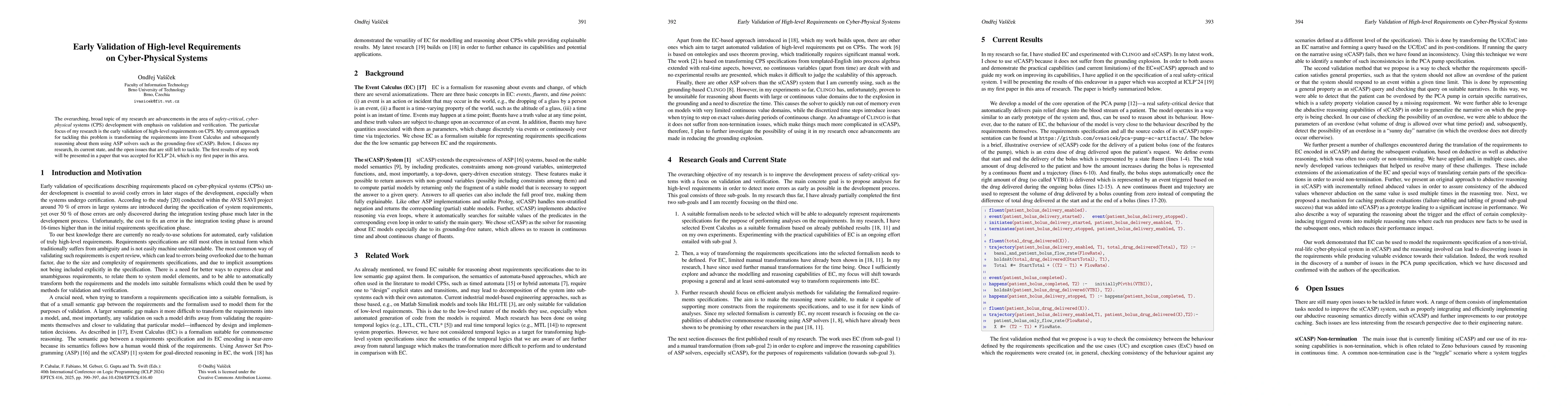 The overarching, broad topic of my research are advancements in the area of safety-critical, cyber-physical systems (CPS) development with emphasis on validation and verification. The particular focus of my research is the early validation of high-level requirements on CPS. My current approach for tackling this problem is transforming the requirements into Event Calculus and subsequently reasoning about them using ASP solvers such as the grounding-free s(CASP). Below, I discuss my research, its current state, and the open issues that are still left to tackle. The first results of my work will be presented in a paper that was accepted for ICLP'24, which is my first paper in this area.