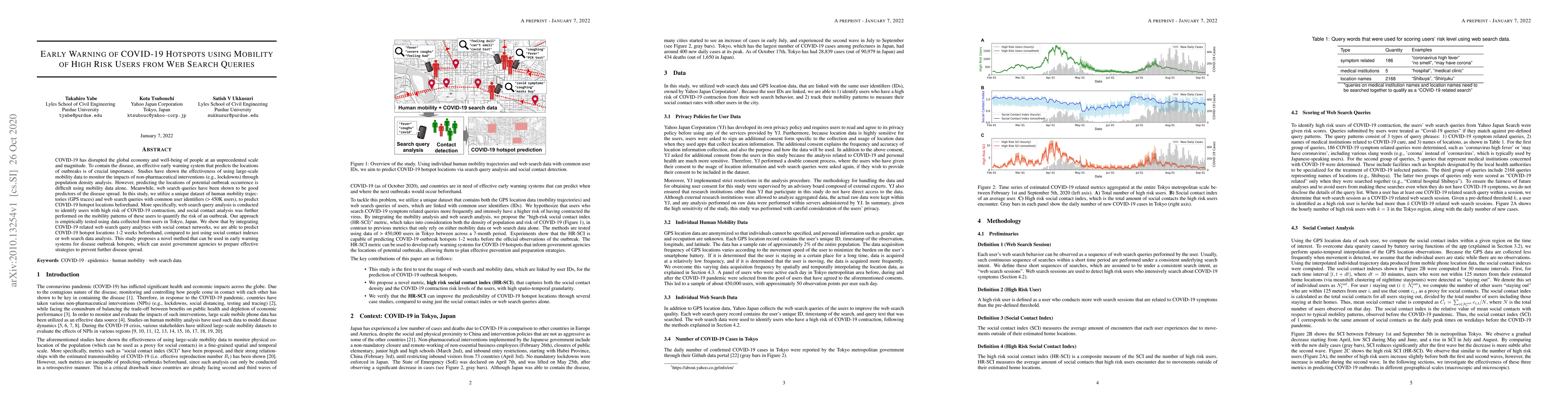 This study combines web search query data and high-risk user mobility patterns to predict COVID-19 hotspots up to two weeks in advance, demonstrating improved accuracy over traditional methods. The approach, tested in Tokyo, Japan, integrates COVID-19 related search queries with social contact networks to enhance early warning systems.